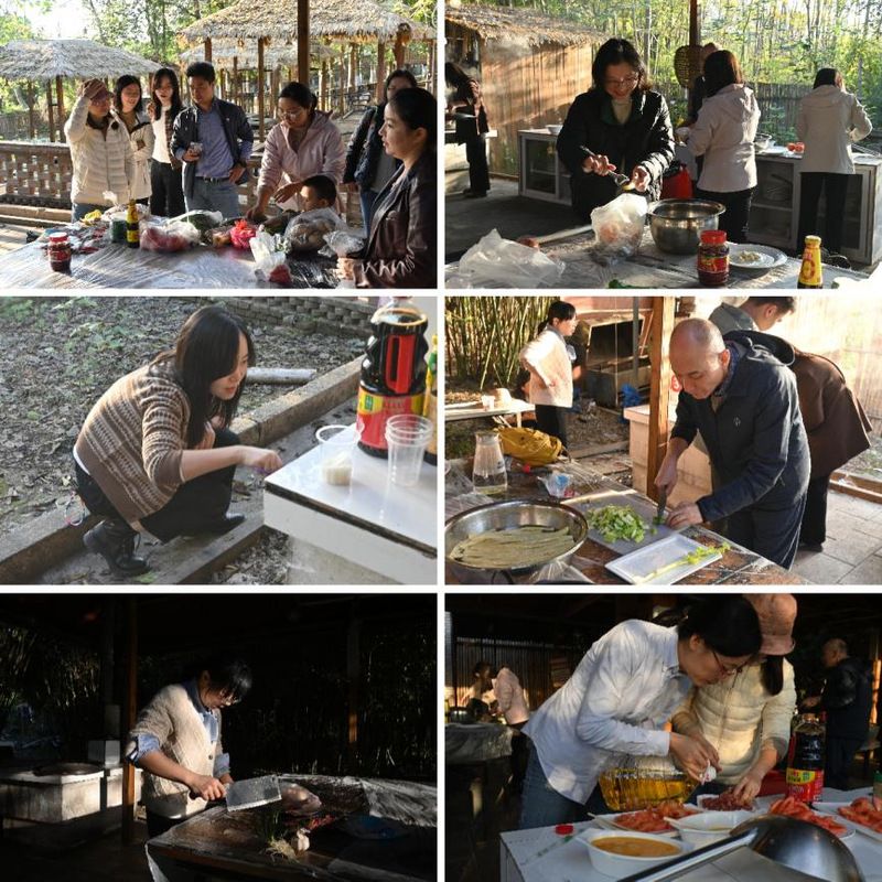 随后的“厨艺共飨”环节,老师们分工协作,洗切炒煮间,香辣虾、手抓饭、爆炒花甲、炖猪蹄等佳肴陆续出锅,香气弥漫庄园。未参赛教师化身“大众评委”,手持贴纸为心仪菜品投票,现场烹饪声与欢笑声交织,洋溢着轻松温馨的氛围。