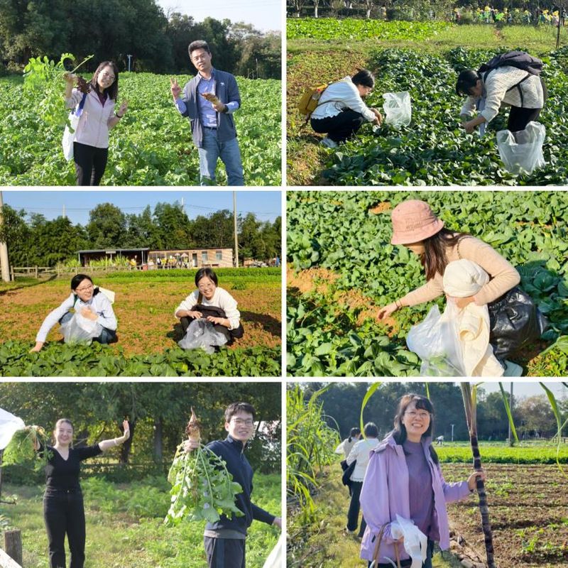 午后,教职工们统一乘车抵达庄园。清幽的环境与葱郁的绿植,为活动铺就亲近自然的惬意背景。田园采摘环节中,老师们穿梭于种植区,亲手采摘甘蔗、小青菜、萝卜等秋季时令作物,在收获的喜悦中轻嗅泥土芬芳,体验农耕乐趣。