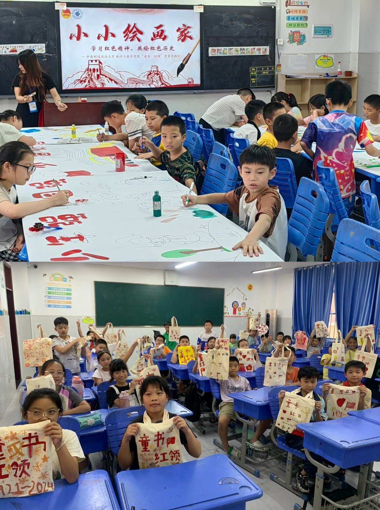 “红色创意工作坊”是支部创新打造的手工作坊,实践队购置五米长画、帆布袋、团扇、画笔等材料,为通城县的留守儿童上了几堂意义满满的实践课程。在“共绘长画”中,孩子们专注地挥动画笔,用五彩斑斓的色彩和生动的笔触描绘长达5米的画布,展现对未来和祖国的美好憧憬;在“五谷杂粮贴旗”中,他们兴致勃勃地用五谷杂粮制作党旗、团旗和少先队旗,学习这些旗帜的深刻含义,每一面旗帜都表达对党的热爱和对祖国的祝福;而“团扇涂鸦”和“帆布袋DIY”中,他们尽情发挥创造力,在团扇上绘制出富有红色元素和革命精神的图案,将红色文化与现代设计巧妙结合,在帆布袋上创作出独一无二的作品,展现了青少年的艺术天赋和无限的创造力。本次“红色创意工作坊”特色活动在地方上引起了广泛的关注和好评,并得到湖北省咸宁市通城县电视台的采访报道。