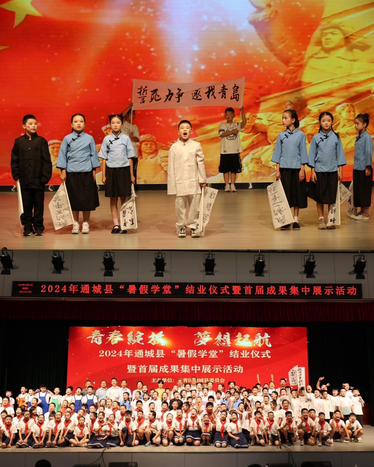 经过精心筹备的“勇敢演说家”与“理性辩论家”比赛,实践队选出了一支由12名优秀少先队员组成的通城县暑期学堂“童书·红领”小小宣讲队。在八一建军节这个特殊的日子里,实践队员们带领小小宣讲队重现了南昌起义的经典场面。面对真实再现的历史场景,孩子们的眼眶湿润,心中涌动着对历史深刻的感悟和对革命先辈们无尽的崇敬。结业仪式上,小小宣讲队以“五四运动”为主题,精心排练了一场生动的舞台剧。舞台上,孩子们如同历史的使者,把五四青年的激昂与当代青少年的奋斗精神巧妙地交织在一起,勾勒出一幅感人至深的画卷。
