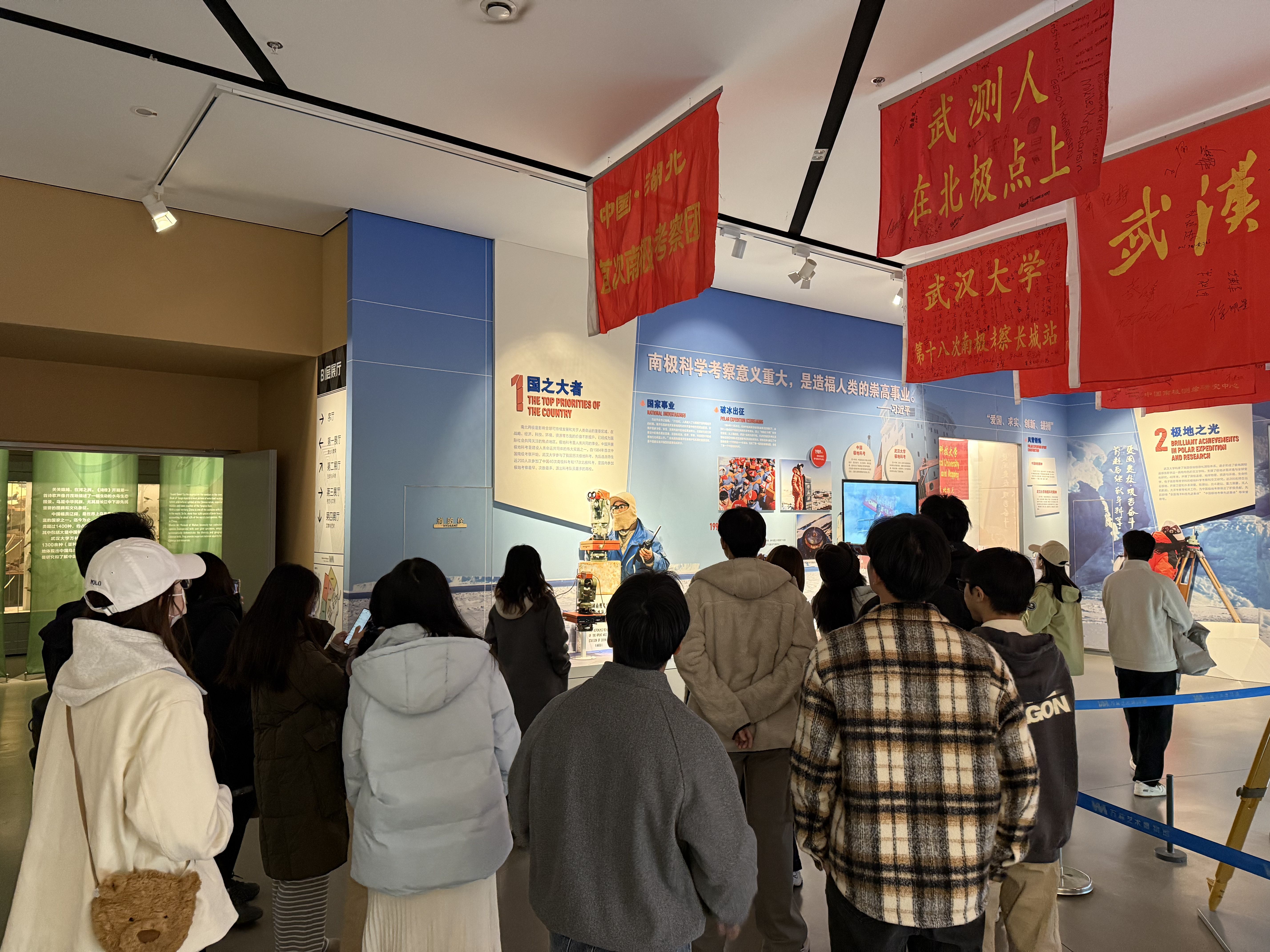 万林博物馆“不负嘱托写壮歌——武汉大学南北极科学考察主题展”分为国之大者、极地之光、中国主张、冰雪探秘四个篇章,共展出98件珍贵科考实物、98件独特极地标本。同学们现场学习了习近平总书记给武汉大学参加中国南北极科学考察队的师生代表回信精神,共同回顾了科学考察队走过的非凡历程,感受一代代极地人艰苦奋斗、拼搏奉献的精神。一面面科考队员亲笔签名的红旗、用于骨折紧急支撑的手工自制塑料靴……,生动再现了科考队员以实际行动服务国家重大战略的坚守与实践。