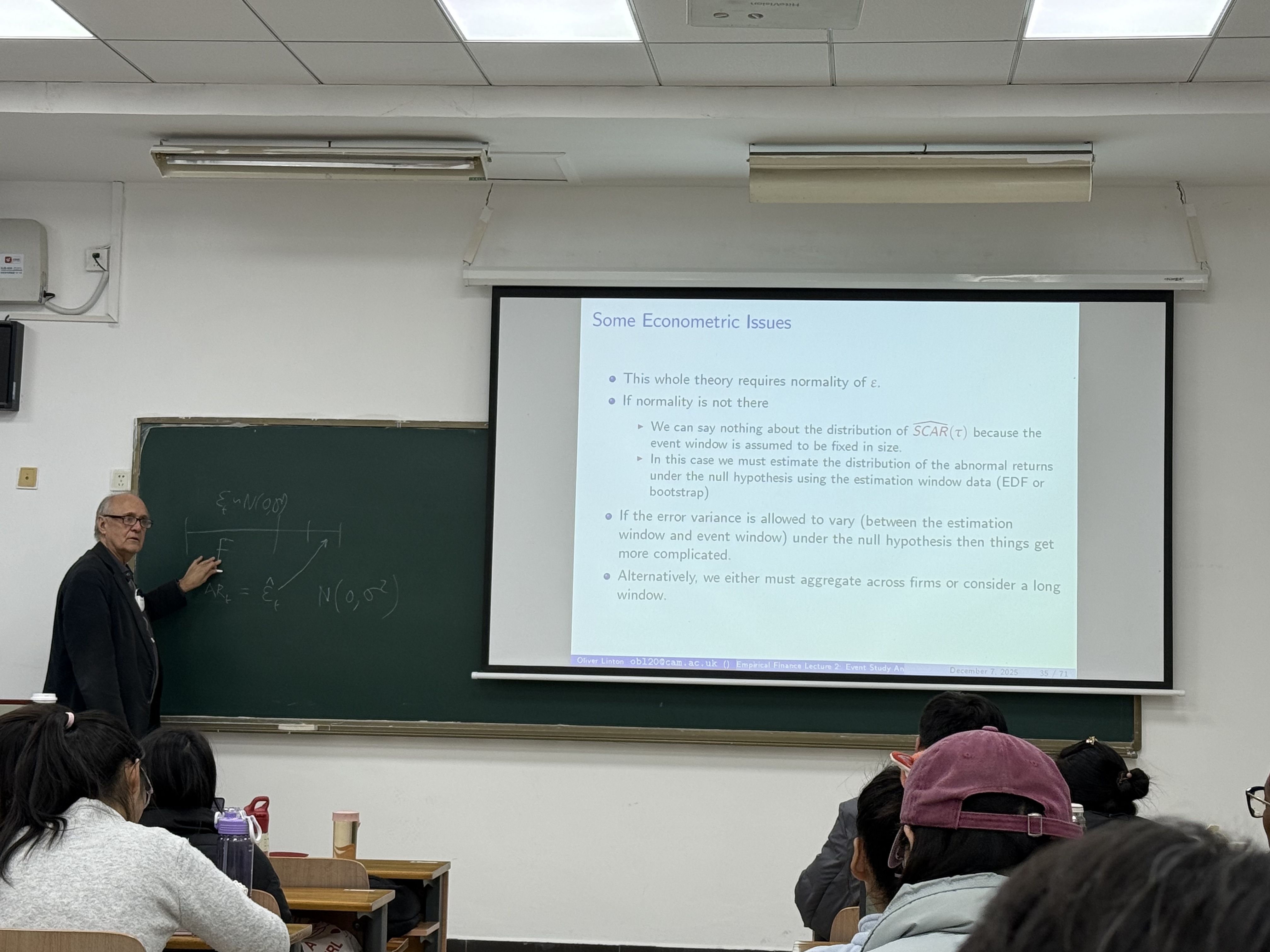 为期五天的短期课程,Oliver Linton教授系统阐述了金融计量的理论及实证。课程涵盖了从有效市场假说、事件研究到投资组合选择、资本资产定价模型、多因子模型及非参数方法的完整体系,并通过数学推导与实证案例展示了这些工具在分析金融市场中的强大能力。课程中,学员们积极参与讨论,Oliver Linton教授也耐心细致地回答了每一个学员的问题。同学们都表示收获颇丰。