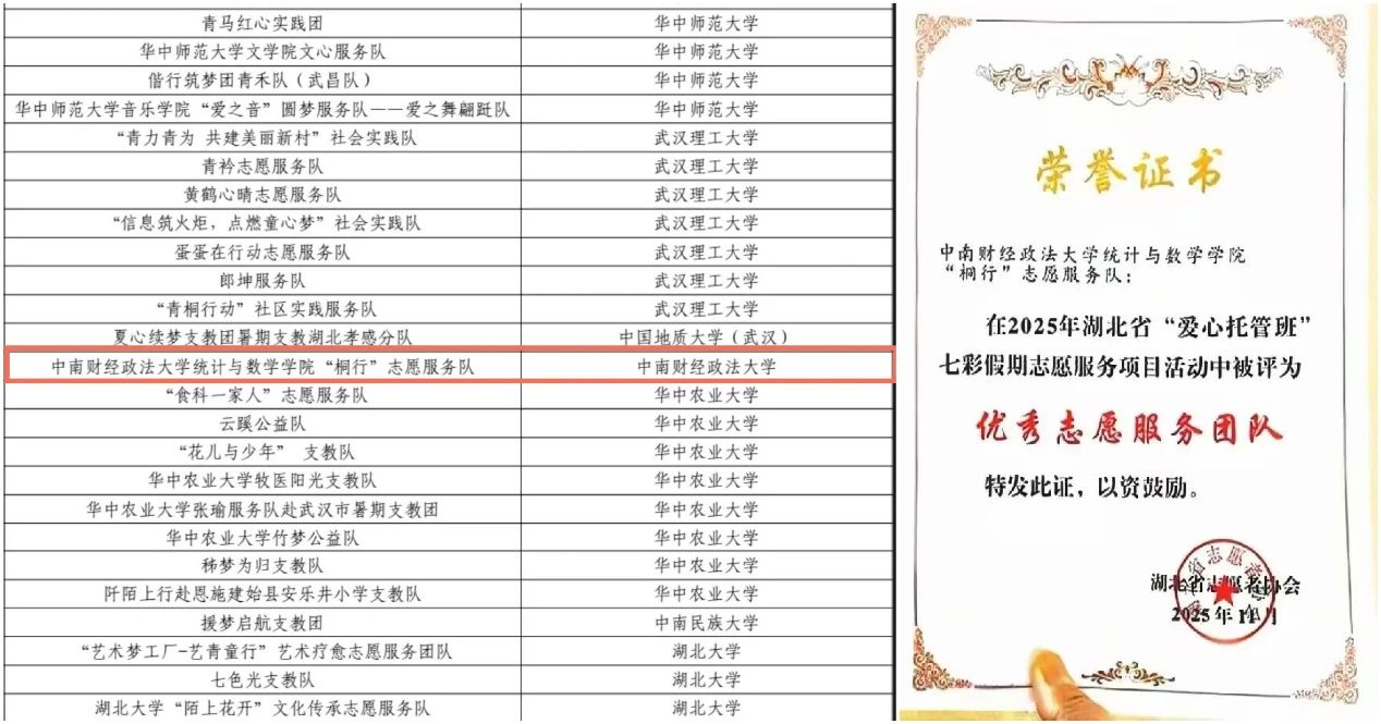 (通讯员:黄欣玥)近期,米兰电竞·(中国区)统计与数学学院“桐行”志愿服务队获评湖北省“爱心托管班”七彩假期志愿服务项目优秀志愿服务团队。这份荣誉,既是对学院长期以来支持志愿服务、深耕实践育人工作的认可,也是对“桐行”团队扎根基层、奉献担当的充分肯定。