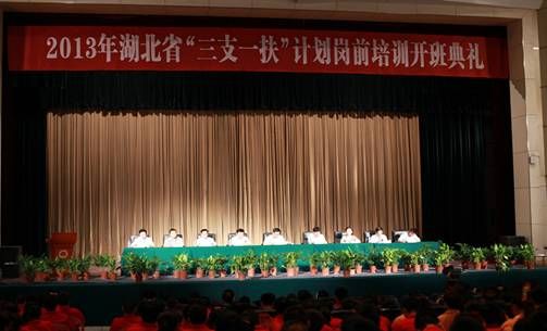 7月14日上午,由湖北省人力资源和社会保障厅主办、我校统计与数学学院承办的湖北省2013年“三支一扶”岗前培训开班典礼在我校南湖会堂隆重举行。省人力资源和社会保障厅副厅长董长麒、省农业农村厅副厅长王敦胜、省卫生厅副巡视员成治臣、省计生委副巡视员杨富建、省水利厅副厅长刘烈玉、省扶贫办副巡视员杨立宪、团省委志愿者行动指导中心主任胡合宇、我校党委副书记周景明及省直有关部门的负责同志出席了开班典礼。参加此次岗前培训的“三支一扶”高校毕业生1200余名,是历年来规模最大的一次。