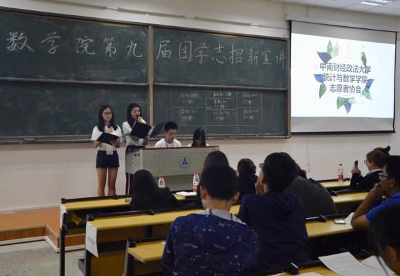 2017923日下午2点,统计与数学学院第九届团学志招新宣讲大会于首义校区30号楼303教室正式举行。统计与数学学院分团委书记兼2017级辅导员胡瑢老师、分团委学生副书记李梦莲、学生会主席邓宇航、志愿者协会会长曾洁颖、学生会副主席刘晶、学生会副主席张琬婷、志愿者协会副会长刘焱茹参加了本次大会。大会由学生会副主席刘晶主持。