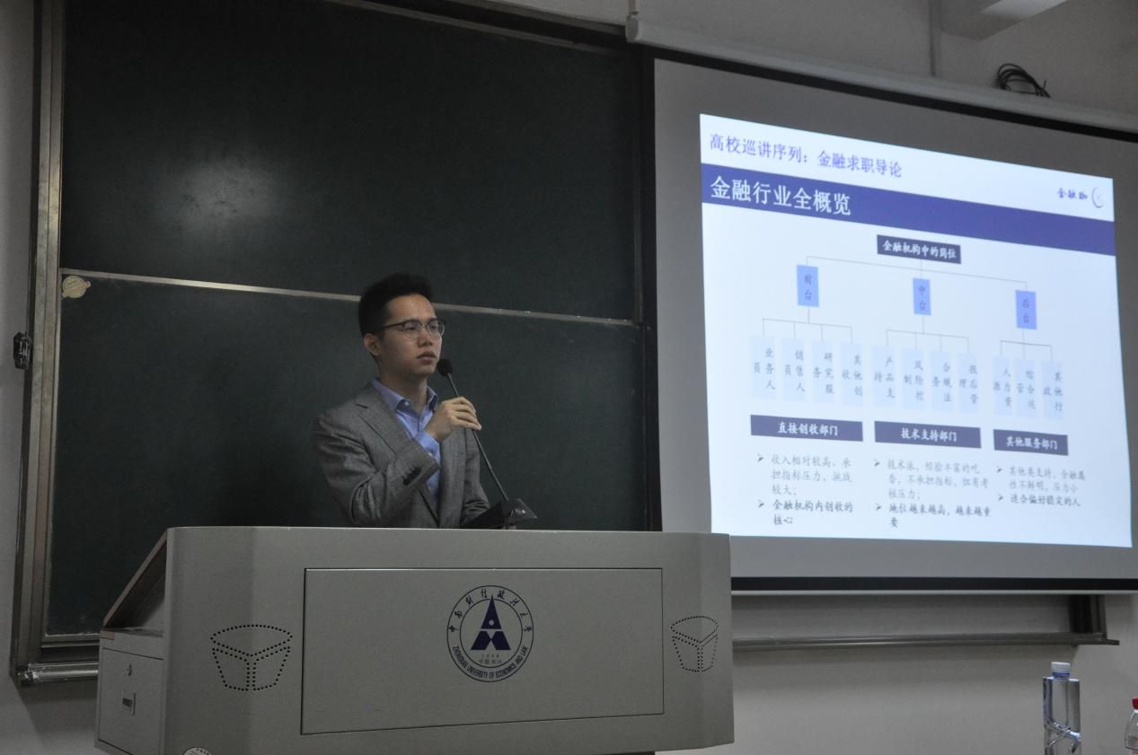 首先,谢宏师兄进行了发言。谢宏师兄2013年毕业于华中科技大学,2016年毕业于新加坡国立大学,目前就职于天风证券股份有限公司。他首先介绍了金融行业的普遍薪酬规模,随后讲述了该行业存在的商业银行、证券公司、基金公司等机构的概览,以金融机构为例,其设有如前、中、台等不同的岗位,分岗位的职能和特点各不相同。接下来,谢师兄讲述了商业银行等金融机构在我国的区域分布情况,他指出其主要集中在一线城市的。最后,师兄提出要了解岗位,了解自己,定位自己,明确努力的方向。
