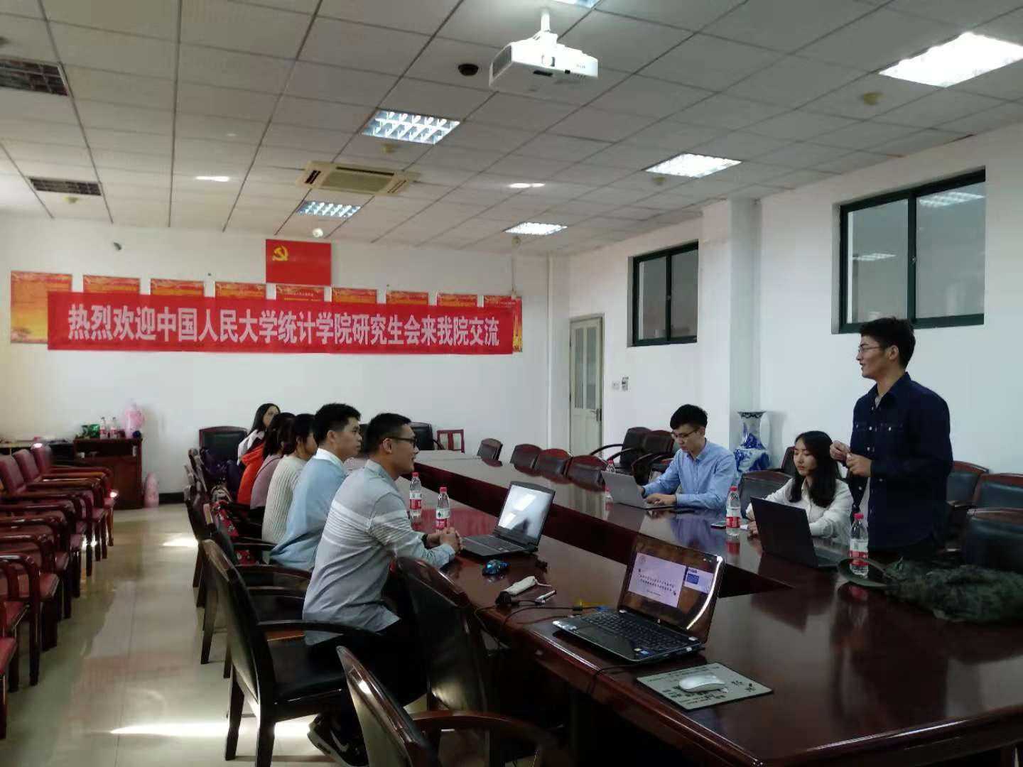 2018年10月27日,中国人民大学统计学院研究生会代表来访我校,并在文波楼统计与数学学院四楼会议室与我院研究生会成员进行座谈交流。中国人民大学统计学院研究生骨干代表肖永强、林诗雅和黄勇同学参加此次交流。座谈会由我院研究生会主席李坤主持。