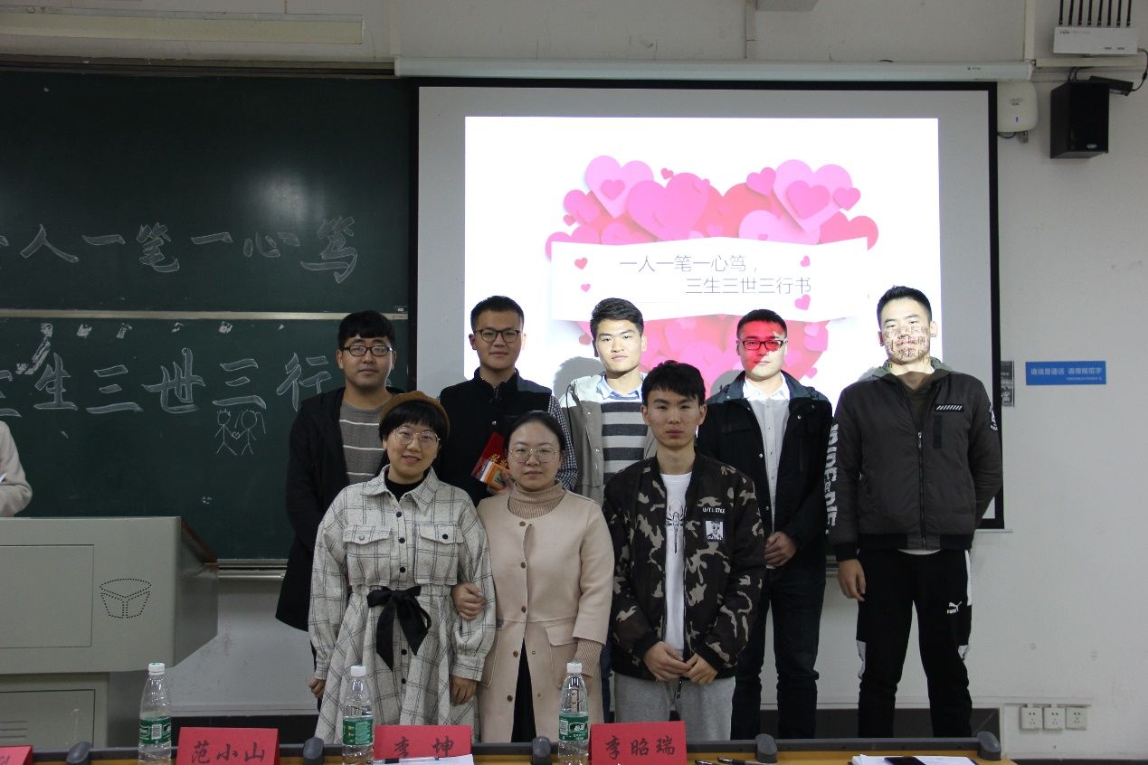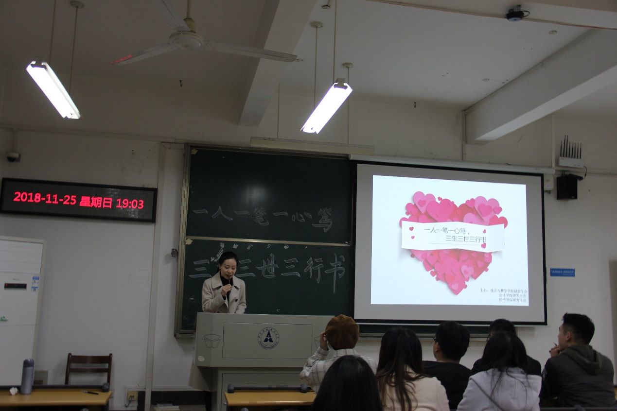 2018年11月25日,为给同学们公开表达情感的机会,让自己被爱的同时,也学会如何去爱对方;以及锻炼同学们的自信心和勇气,由我院研会宣传部主办,经济学院研会、会计学院研会协办了“一人一笔一心笃,三生三世三行书”三行情书诗歌比赛于文添楼105教室成功举行。