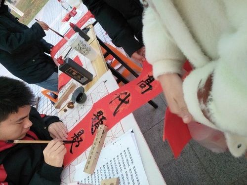 本次活动于23日下午13点半正式开展,活动当天志愿者分别在首义广场与五羊广场摆放帐篷、展板和桌子等物品,向来往的同学介绍本次活动,同时将书画协会的同学写好的春联进行赠送。活动吸引了大量的同学,帐篷前等待领取春联的同学骆驿不绝,还有的同学自愿帮志愿者们一起为大家写春联,送出了自己的一份祝福。四个小时的活动中,志愿者们都热情投入,送出了很多副春联,让校园有了提前过春节的气氛。活动于当天下午17点半结束,志愿者们对相关物资进行了整理,并做好了清点工作。