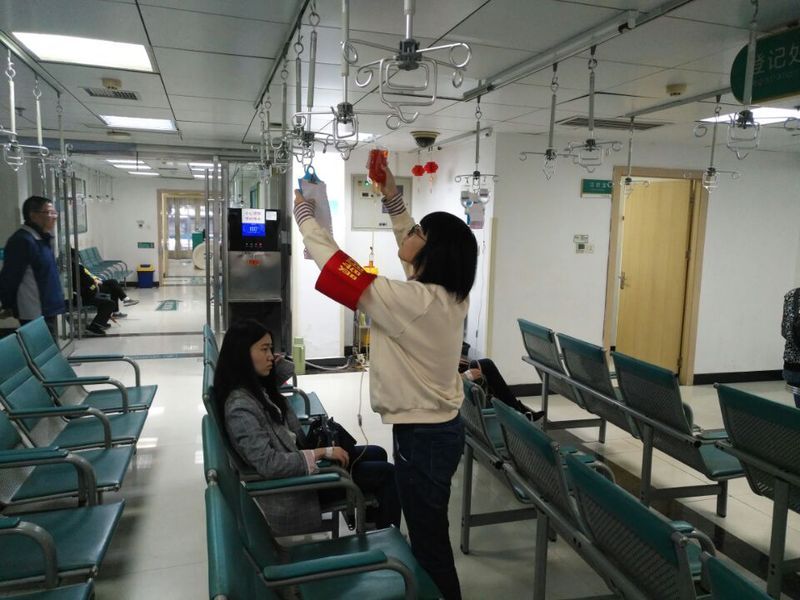 本次活动中,统数志协干事及志愿者分别在门诊大厅、输液室以及烧伤门诊处进行志愿服务,引导患者使用自助挂号机并为患者进行挂吊瓶倒水等服务。
