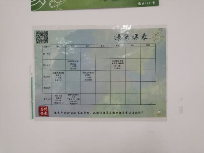 下午四时,各教室课表已陆续张贴完毕,本次绿色课表活动落下帷幕,接下来的一整个学期,同学们都将享受绿色课表带来的便利。