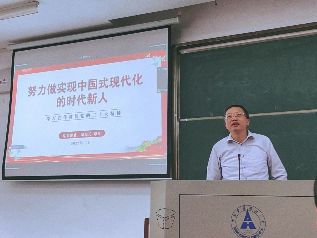 校党委常、副校长覃红以《努力做实现中国式现代化的时代新人》为题讲授专题党课,覃校长以学习宣传贯彻党的二十大精神为主线,强调了中国式现代化在全面推进中华民族伟大复兴进程中的重要作用,分析比较了西方现代化进程和中国式现代化进程,并分享了中国共产党对现代化的实践探索。最后,覃校长寄语全体学员要有爱国情怀、社会责任感、创新精神、实践能力,努力成为坚定理想、担当尽责,拼搏奋斗、不负青春,刻苦学习、锐意创新的时代新人。
