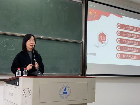 王书记从习近平主席对文化自信的阐释,以及相关文件政策解读出发,生动形象地向同学们展示了文化自信的深刻含义,她指出文化自信是一个民族、一个国家以及一个政党对自身文化价值的充分肯定和积极践行,并对其文化的生命力持有的坚定信心。随后,王书记又由深刻含义延伸出文化自信底蕴的基本内容的表述,分别从从容与大气地对待世界各民族文化;坚持社会主义核心价值体系及其主流文化;保持创造的姿态推进文化创新,增强我国文化发展的活力三个递进关系的维度归结出我们我们对待世界文化与本土文化的态度。最后,结合了个人发展,国家发展与文化自信之间的关系,并说明要增强文化自信,是我们提升文化软实力、建设社会主义文化强国的重要路径。