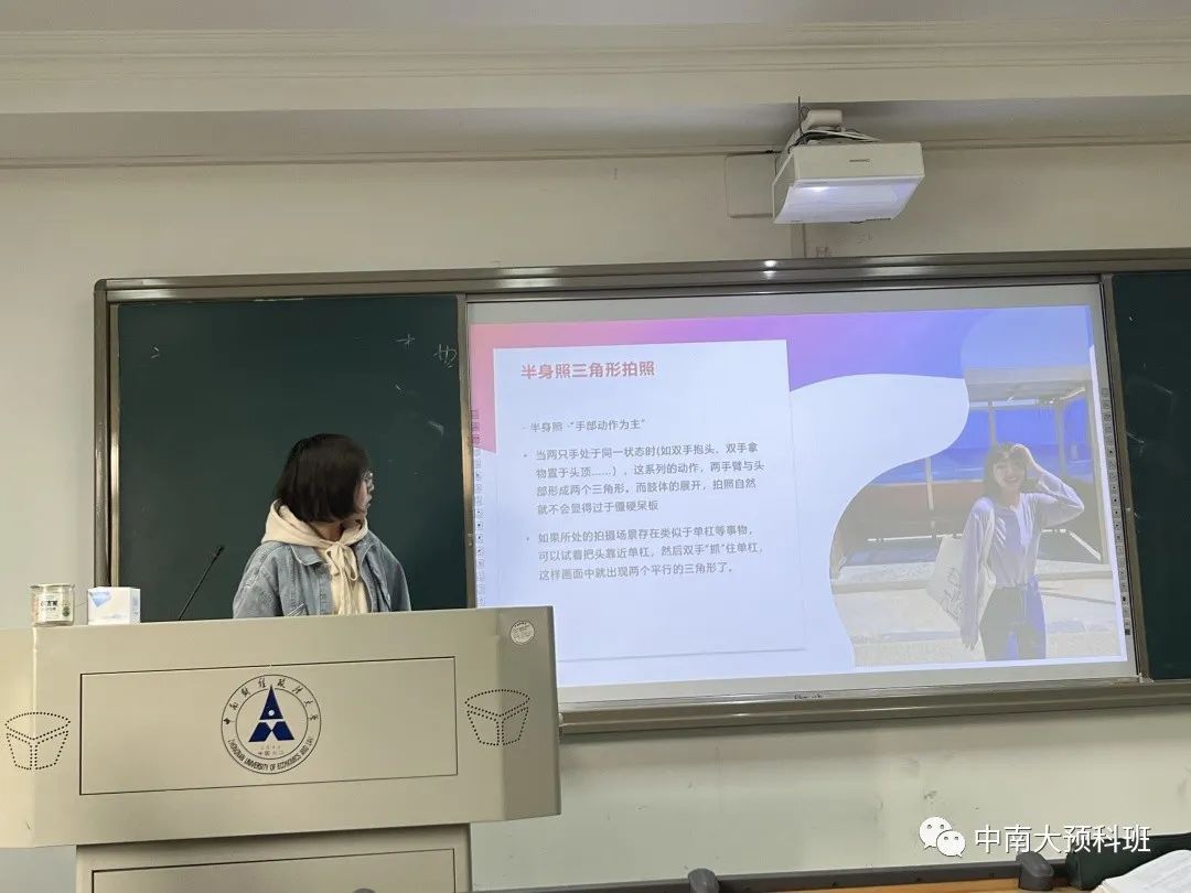 黎小娜同学向大家介绍了“三角形拍照法”,即半身照三角形拍照、坐姿的“三角形”构图、站姿三角形三大部分。三角形构图就是指利用画面中的若干景物,按照三角形的结构进行构图拍摄,或者是对本身就拥有三角形元素的主体进行构图拍摄。通过黎小娜同学的介绍,大家纷纷表示学到了。