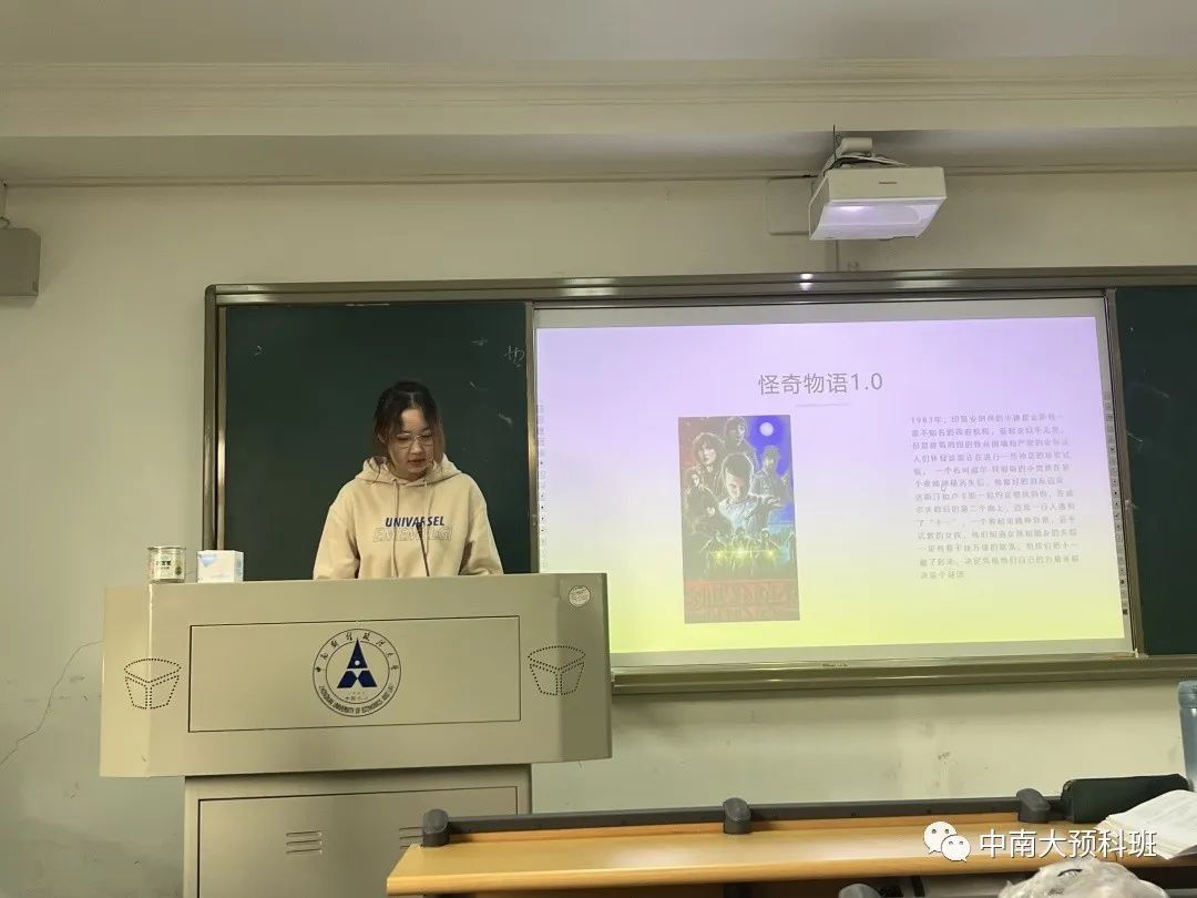 孜那提同学进行美剧推荐——《怪奇物语》。她分别描述了四部《怪奇物语》系列电视剧的主要内容,推荐同学们从头进行观看以更好了解故事背景。《怪奇物语》作为Netflix 年度十大好剧之一,这部剧带来的观影感受是很刺激的,电视剧里有反自然现象的逆世界。