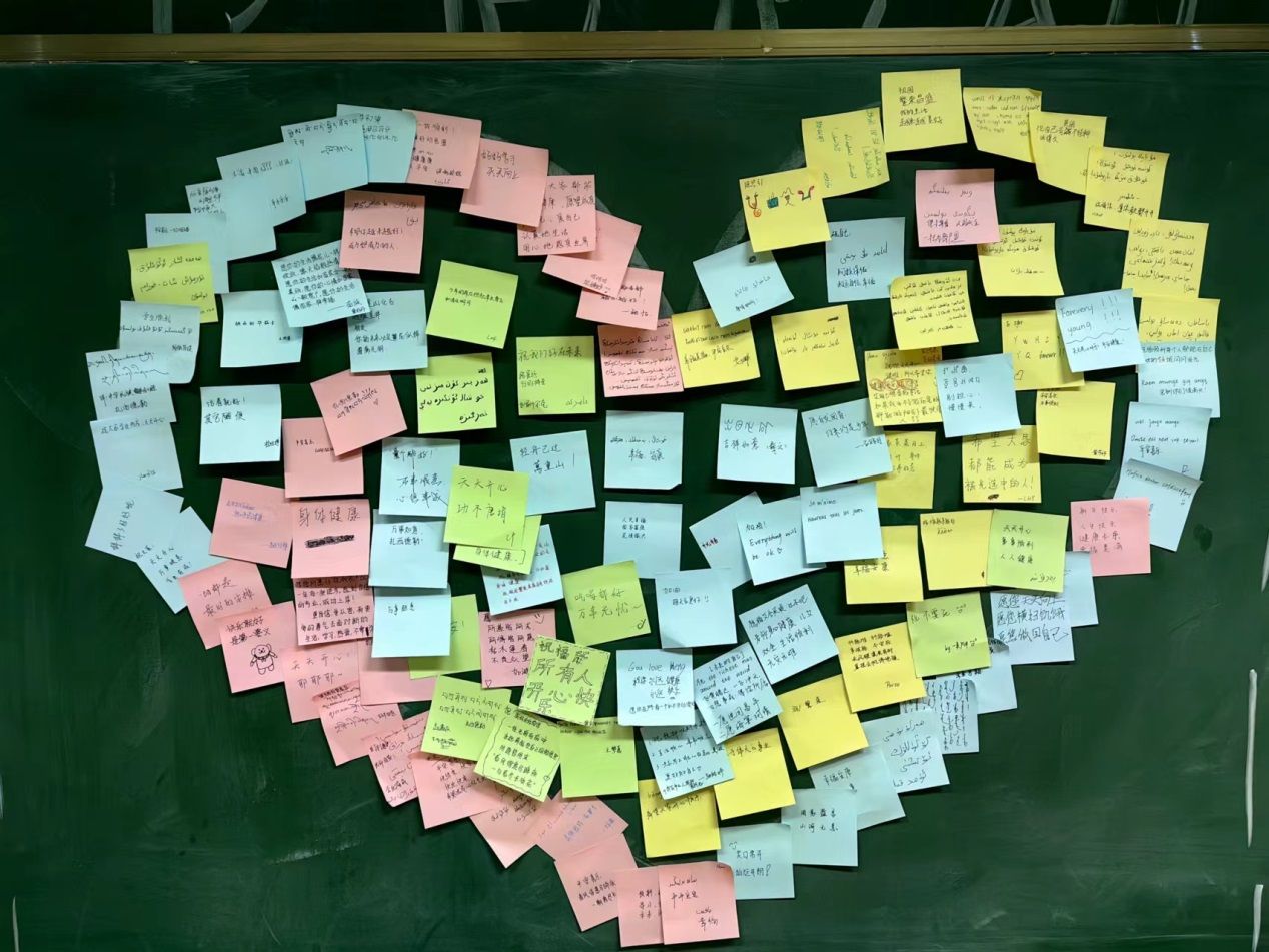 随后,开场小游戏击鼓传花以“花”为引,通过提问让预科同学对未来的目标和学习生活进行了思考,同学们真诚地分享了自己的想法;在民族知识小问答环节,同学们更是热情讨论,积极回答。小问答结束后,每位同学都用本民族的语言在便利贴上写下了祝福,并在黑板上组成了爱心图案,美好的愿景跃然于心。在接下来的你画我猜小游戏中,气氛达到高潮,活动现场趣味横生,欢声不断,预科同学们踊跃报名、积极参与,更是用默契展现了同学之间深厚的情谊。
