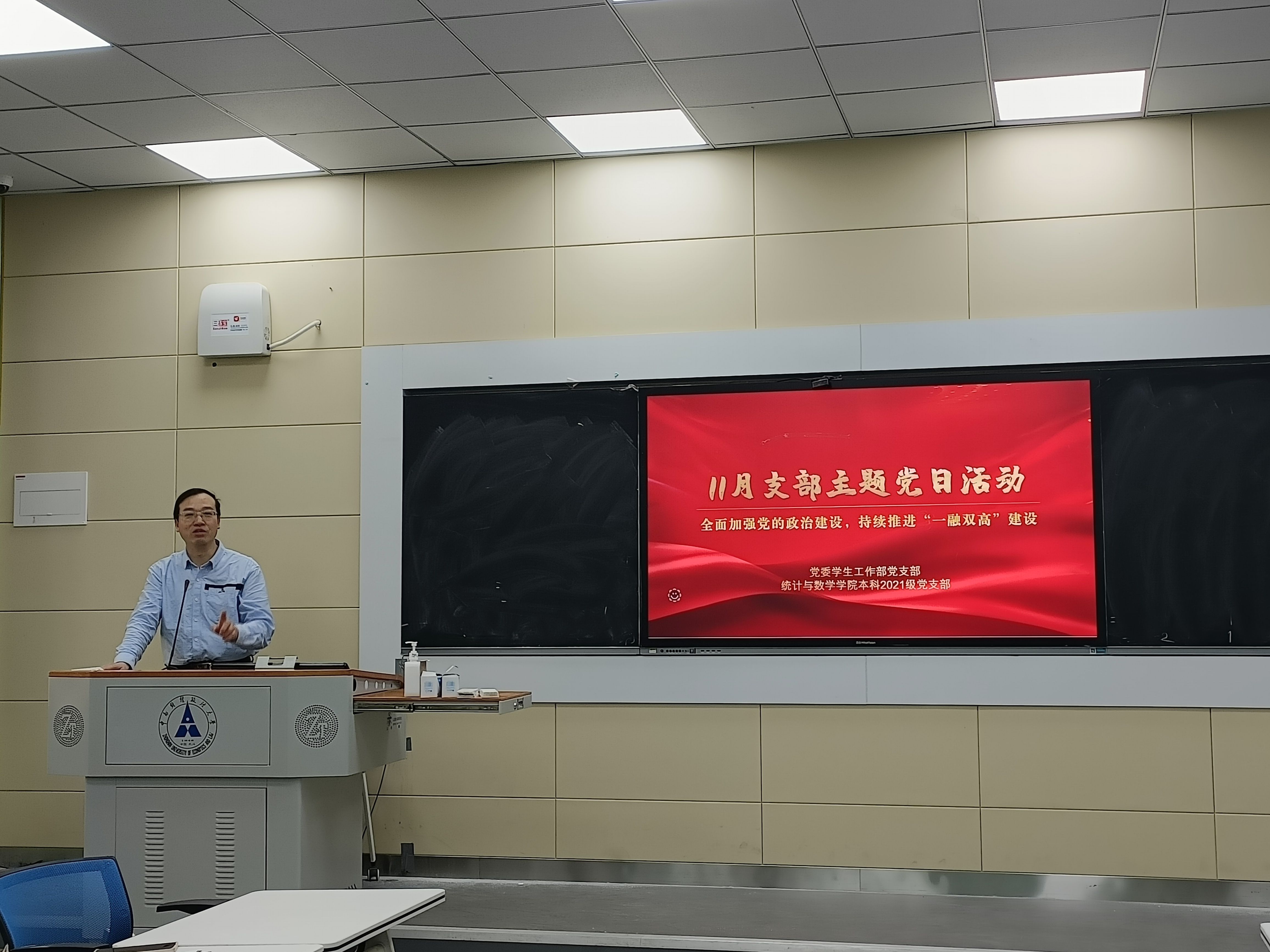 活动伊始,统计与数学学院2021级本科生党支部学生党支部书记林静琳以“百年大计,教育为本”为题主讲了一月一党课。从她自身在党和政府的帮助下考到重点大学的教育经历引入,渐渐深入到教学资源的建设工作、教育规模的发展过程、教育强国的时代课题,并结合新一轮科技革命的时代背景,讲述了自己作为统数学子的担当作为,带来了一节接地气、有高度、有价值的主题党课。