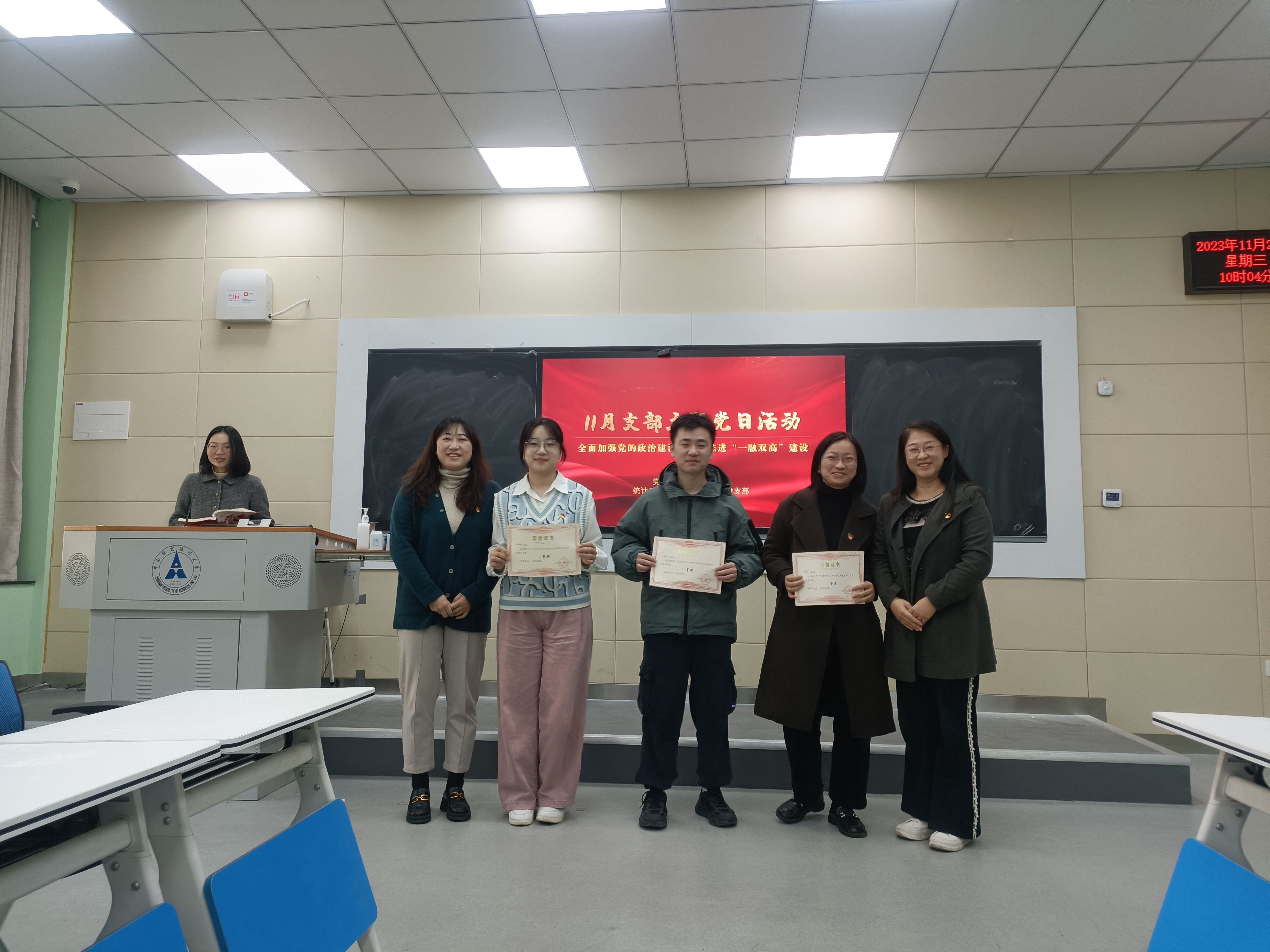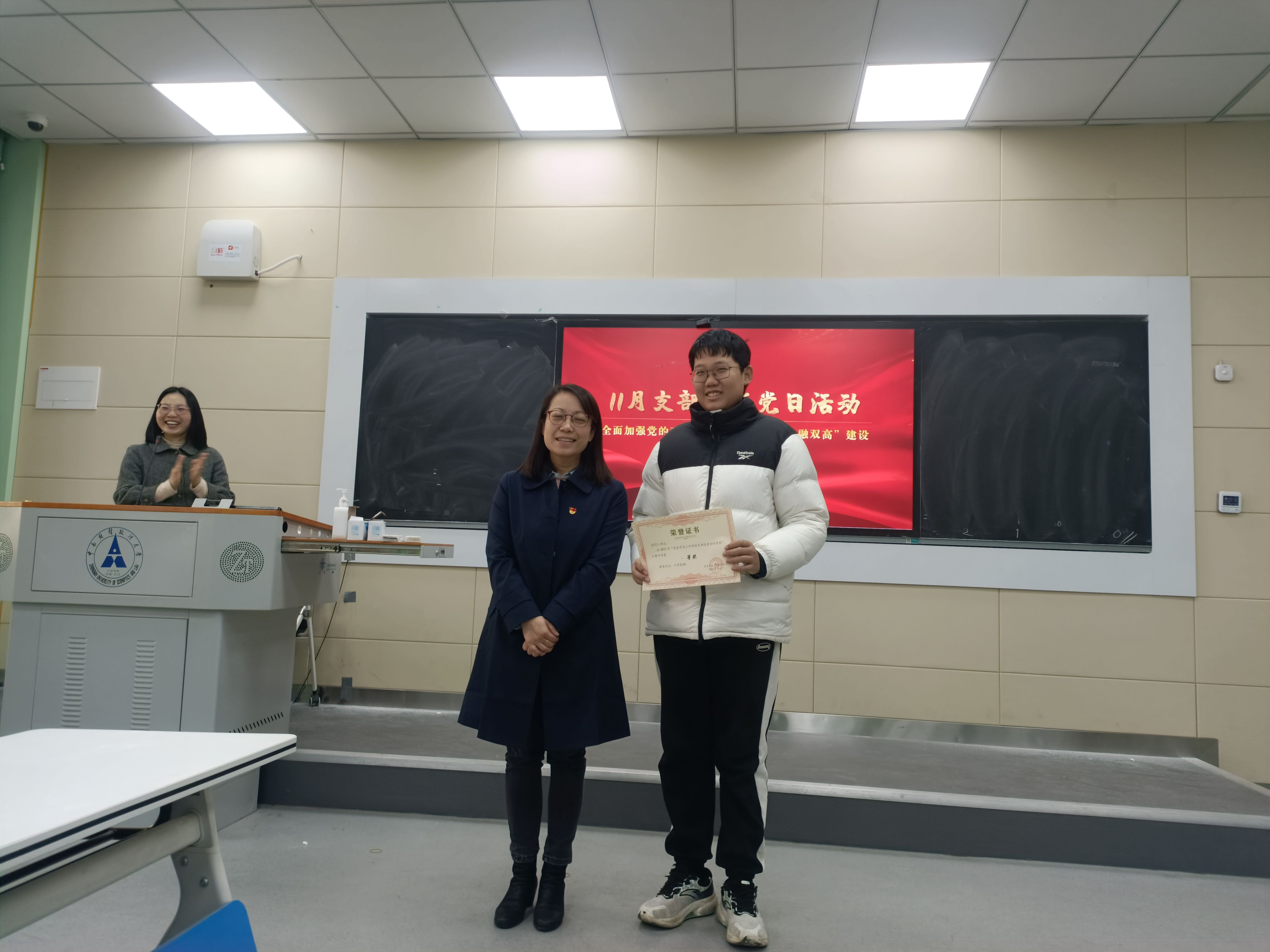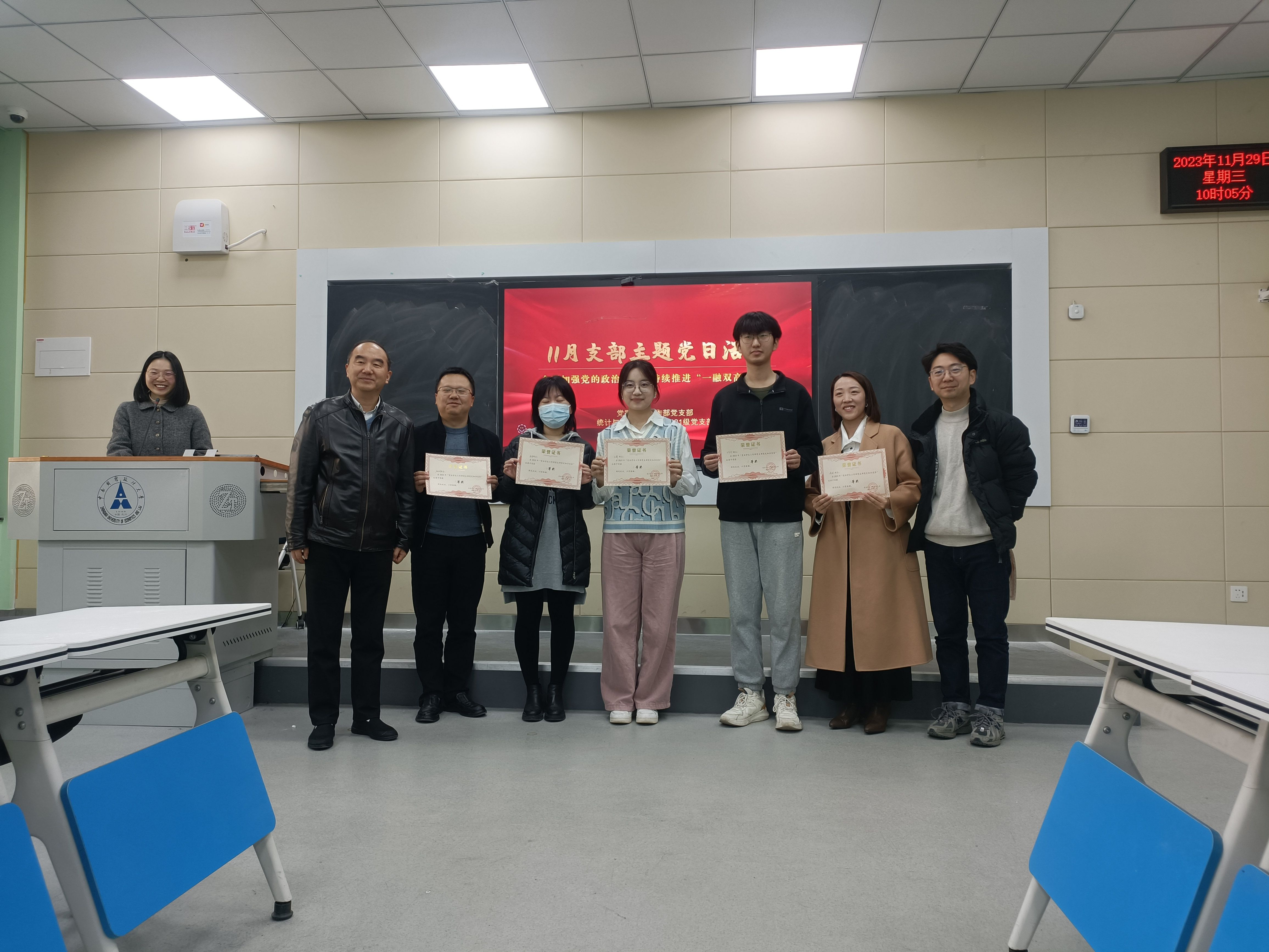 在最后的党史知识竞答环节,每位同志情绪高昂、积极抢答,现场气氛热烈。每位同志情绪高昂、积极抢答,现场气氛热烈。经过紧张的竞答环节,决出一等奖一名、二等奖三名、三等奖五名,获奖者与嘉宾合影留念。在趣味的党史竞猜活动中,加强了支部成员对党史的了解与学习,进一步增强了同学们对于党史党章的认知和理解,加强党性修养、巩固学习成果,坚定对党的理想信念追求,激发大家学党史、知党情、感党恩、跟党走的爱国热情。