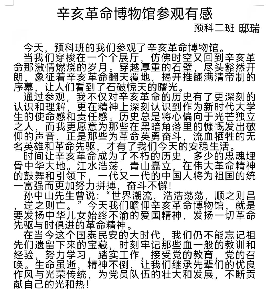 好的本次参观辛亥革命纪念馆活动是少数民族预科教育中心丰富学习教育形式、深入开展爱党爱国情怀教育、身体力行开展革命教育的具体举措之一,预科2302团支部将在此基础上进一步推动预科班学习教育工作落到实处。