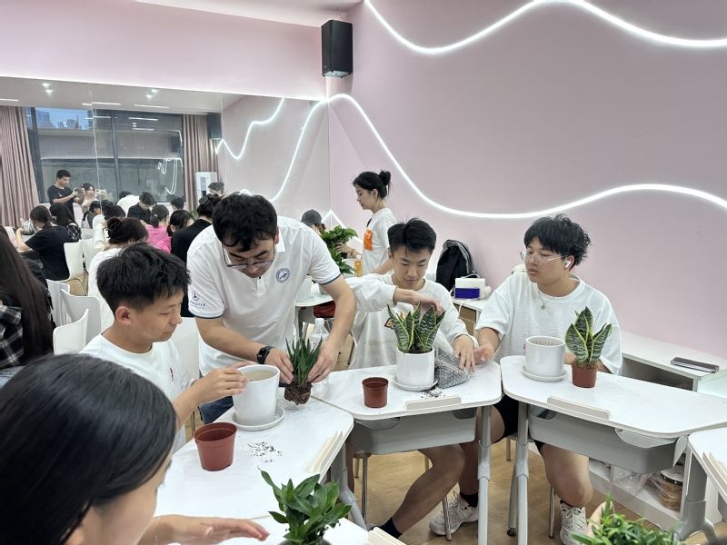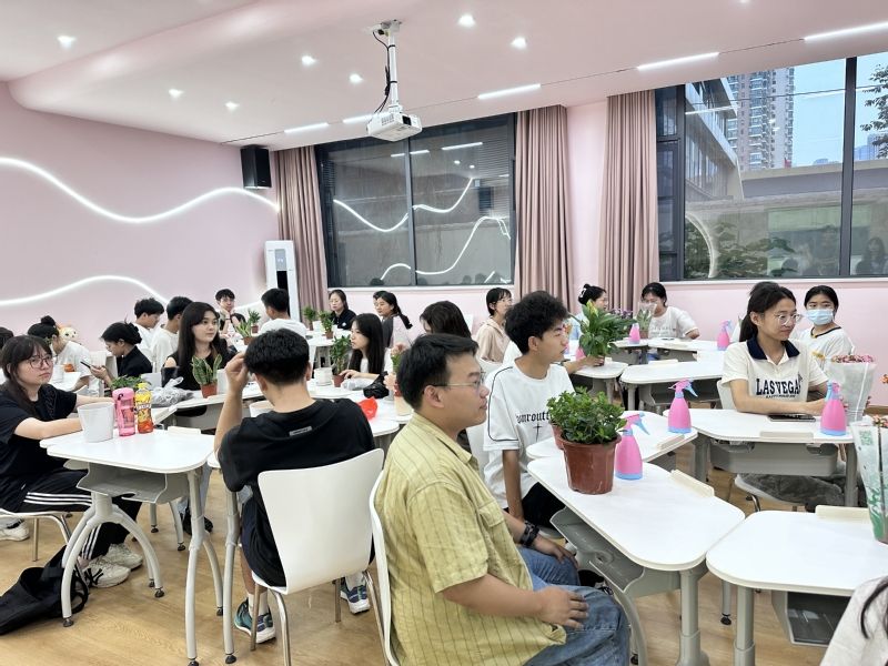 活动的亮点之一是结合了线上与线下的互动方式。在线下教学环节,同学们聚集在文瀚107学生驿站,亲手种下了属于自己的太阳花,体验了园艺的乐趣。而在线上环节,同学们则通过微信小程序“鹅打卡”记录盆栽的成长情况和自己的养护心得。这种新颖的形式不仅激发了同学们的参与热情,还让他们在关注绿植成长的同时,也关注自己的内心变化。