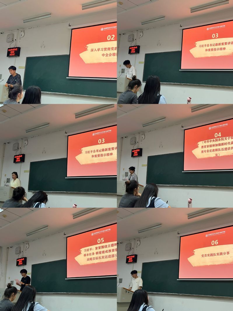 全体同志重温了入党誓词,提醒自身“不忘初心、牢记使命”。学习分享环节由多名预备党员同志领学并分享学习心得。张泽宇同志分享深入学习贯彻党的二十届三中全会精神的相关感悟,他表示,通过学习全会公报和相关文件,他深刻理解了全会的重大意义、精神实质和丰富内涵,激发了他作为一名党员的责任感和使命感;陈邦远、段项欣同志领学习近平总书记最新重要讲话和重要指示精神,表示作为青年党员,要切实提高政治站位,强化责任担当;刘燕婷同志就《中共中央 国务院关于弘扬教育家精神加强新时代高素质专业化教师队伍建设的意见》进行学习心得分享,结合暑期支教经历,提出教育家精神是教师队伍的核心价值所在,只有学生与教师共同努力,才能构建起一个和谐、积极、向上的教育生态,推动我国教育事业不断迈向新的高度;迟明宇同志围绕习近平总书记在全国教育大会上强调的“紧紧围绕立德树人根本任务 朝着建成教育强国战略目标扎实迈进”进行学习心得分享。