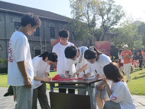 新生们参观了位于红巷的武昌农讲所旧址纪念馆,武昌农讲所是一所由毛泽东同志倡议创办的培养农民运动干部的学校,青砖灰瓦,绿树成荫,古朴的旧教室,让同学们仿佛回到那个令人热血沸腾的年代。在“为祖国母亲献祝福”活动中,同学们积极参与,心有光,入红巷,用心感受红色故事下的烈士英魂,共贺祖国母亲的七十五华诞。