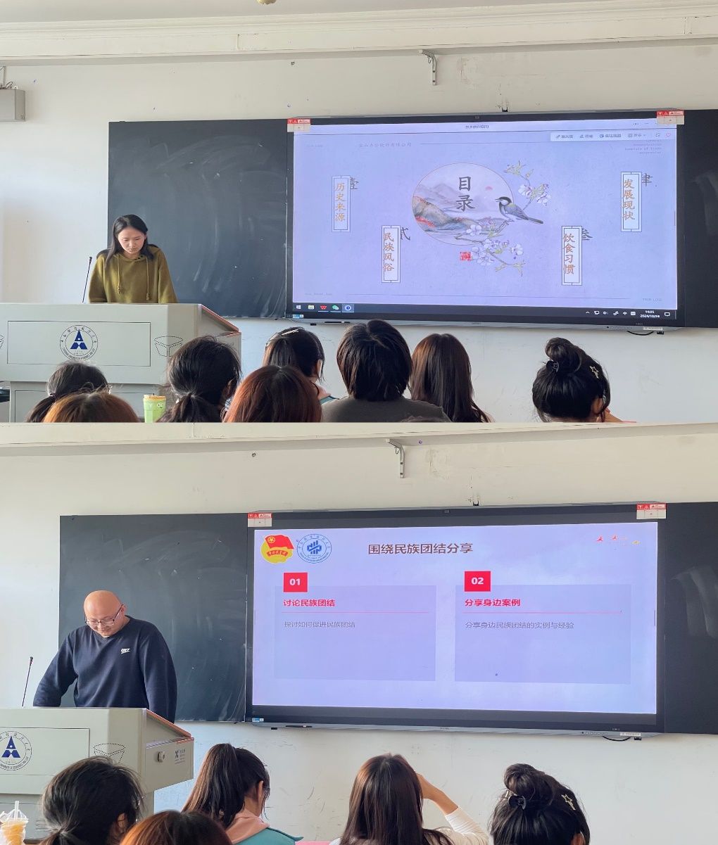 活动开场,团支书首先阐述了活动的主题与目的,营造出浓厚积极的氛围。随后,她播放了一段精心挑选的民族团结相关视频。视频中,各民族丰富多彩的文化习俗、传统节日被一一展现。同学们的目光被视频深深吸引,大家都真切感受到了各民族间深厚的团结友爱之情。