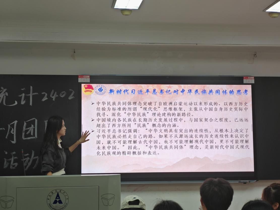(通讯员:李万芸)为学习贯彻习近平总书记关于加强和改进民族工作的重要思想,深化同学们中华民族共同体的意识以及加深对中华民族发展史的了解,2024年10月22日晚,统计2402团支部在文泽楼201教室成功举办以“共画民族同心圆,奏响团结最强音”为主题的团日活动。