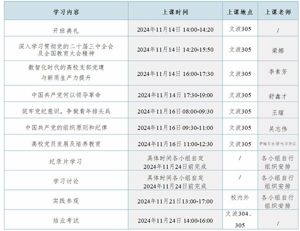 为深入学习贯彻习近平新时代中国特色社会主义思想,深刻领会党的二十届三中全会及全国教育大会精神,切实做好新时代党员发展、教育和管理工作,根据学院分党校教育培训计划,定于2024年11月14日-24日开展第十九期分党校训班,具体安排如下:
