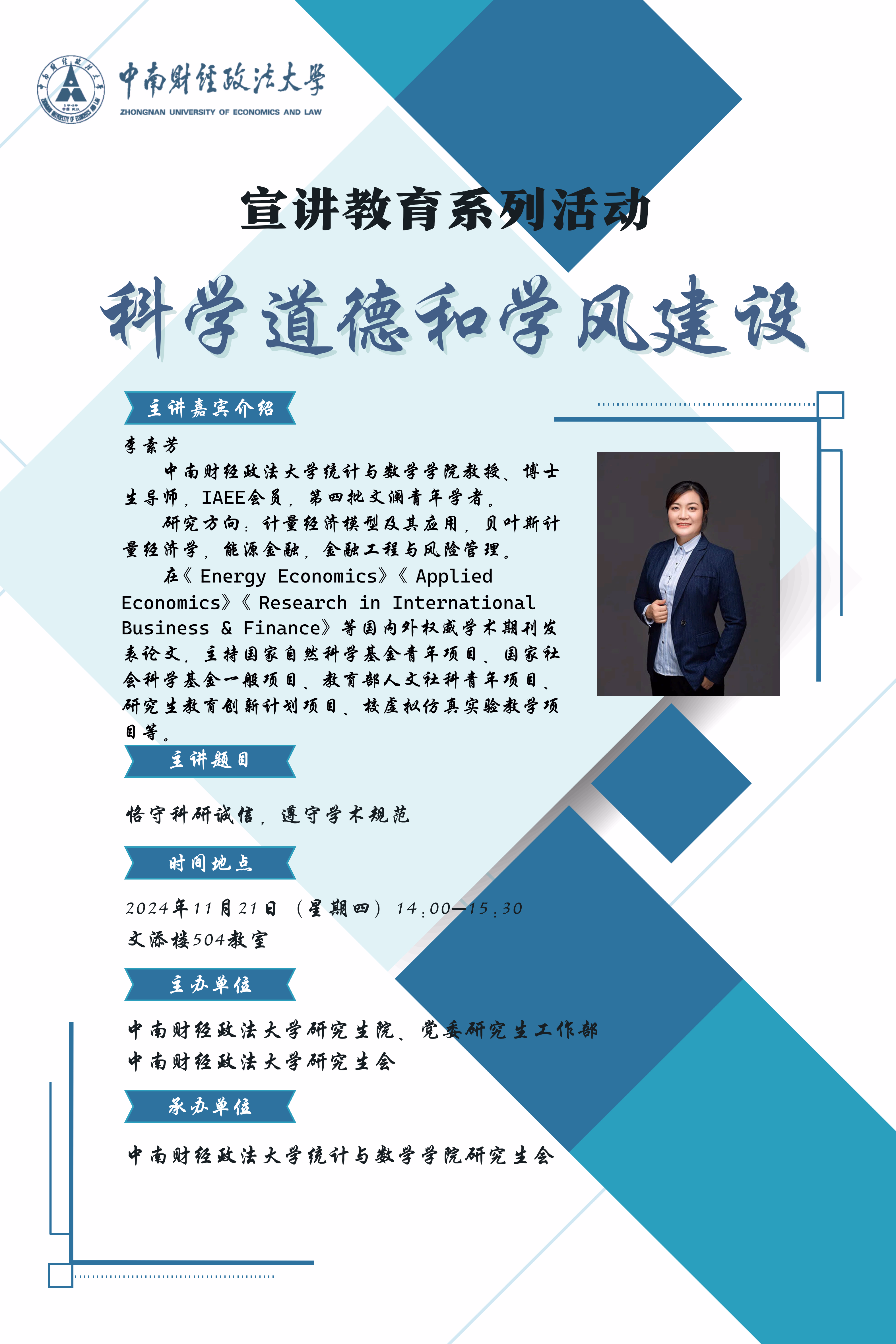 为深入学习贯彻习近平新时代中国特色社会主义思想,全面贯彻落实党的二十大和二十届三中全会精神、全国教育大会精神,学院开展“科学道德和学风建设宣讲教育”系列活动,进一步加强我校师生的科研诚信意识,提升学术规范水平。本次活动旨在通过专家的讲解与分享,引导师生恪守科研诚信,遵守学术规范,共同营造风清气正的学术环境。