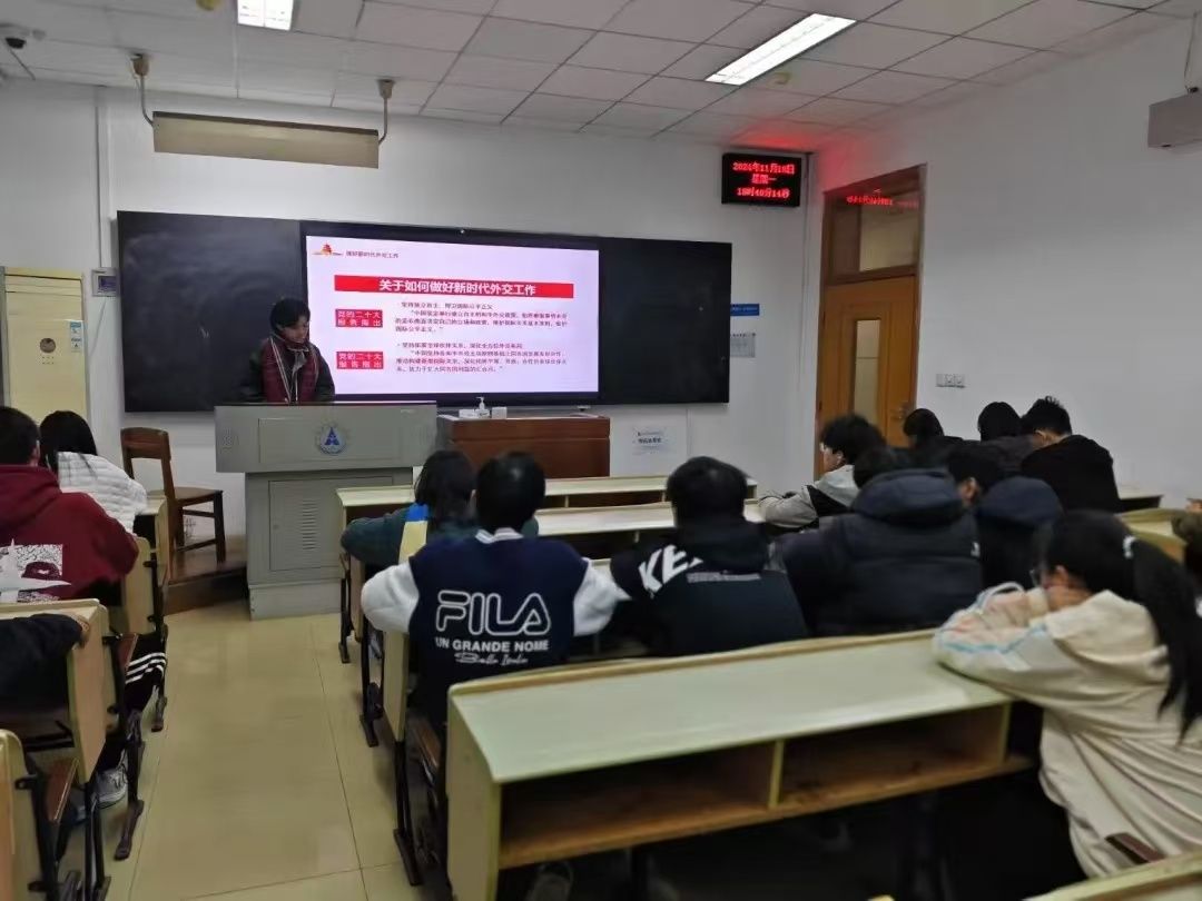 活动伊始,团支书通过精心准备的PPT和视频资料,向同学们介绍新时代外交工作的重要性和特点。这些资料不仅包含丰富的历史背景,还涉及当前国际形势下的外交实践,使同学们对中国特色大国外交有更为直观的认识。同学们被这些资料深深吸引,他们的目光紧紧跟随着屏幕上的每一帧画面,仿佛置身于那些重大外交场合之中。