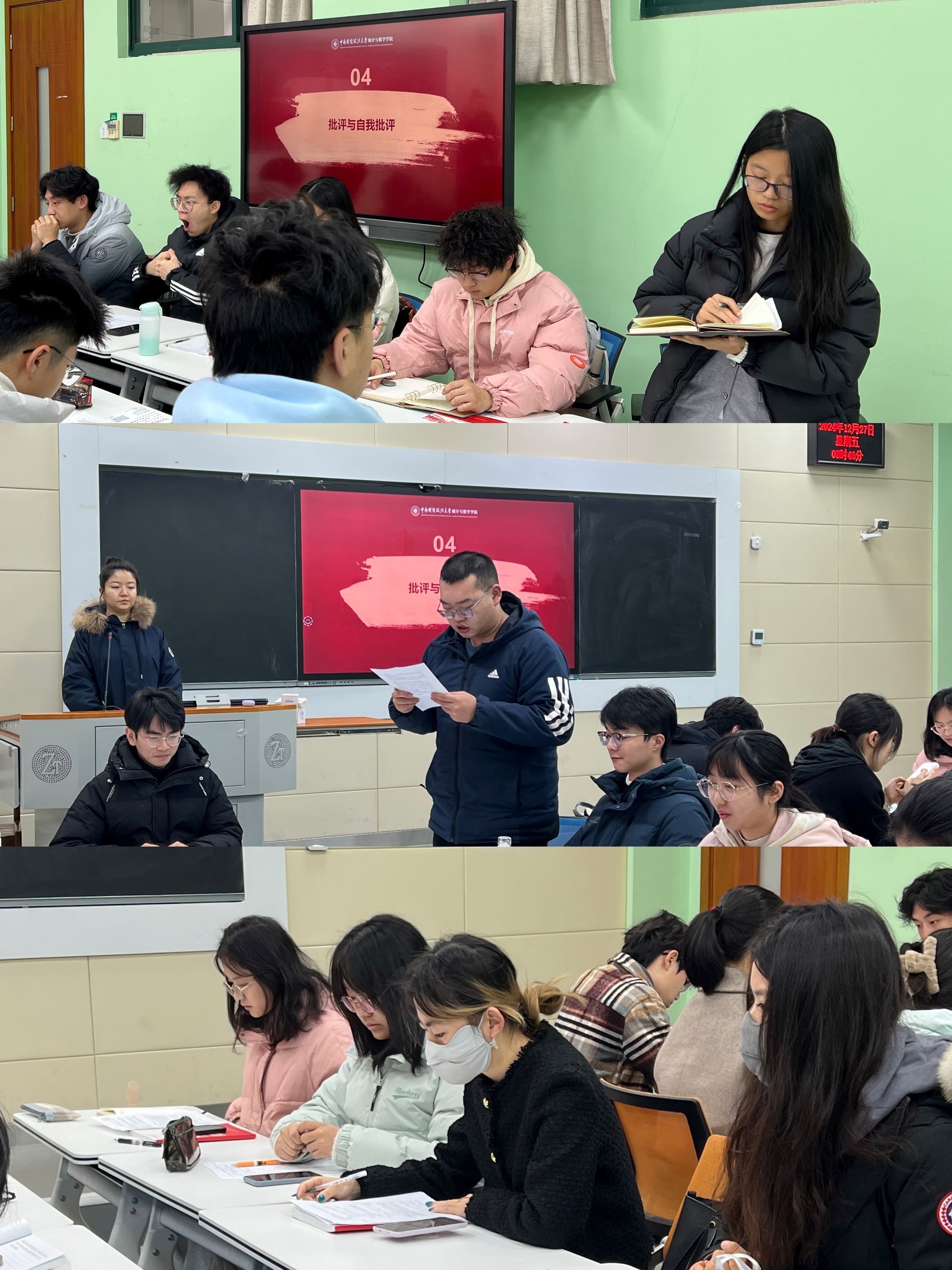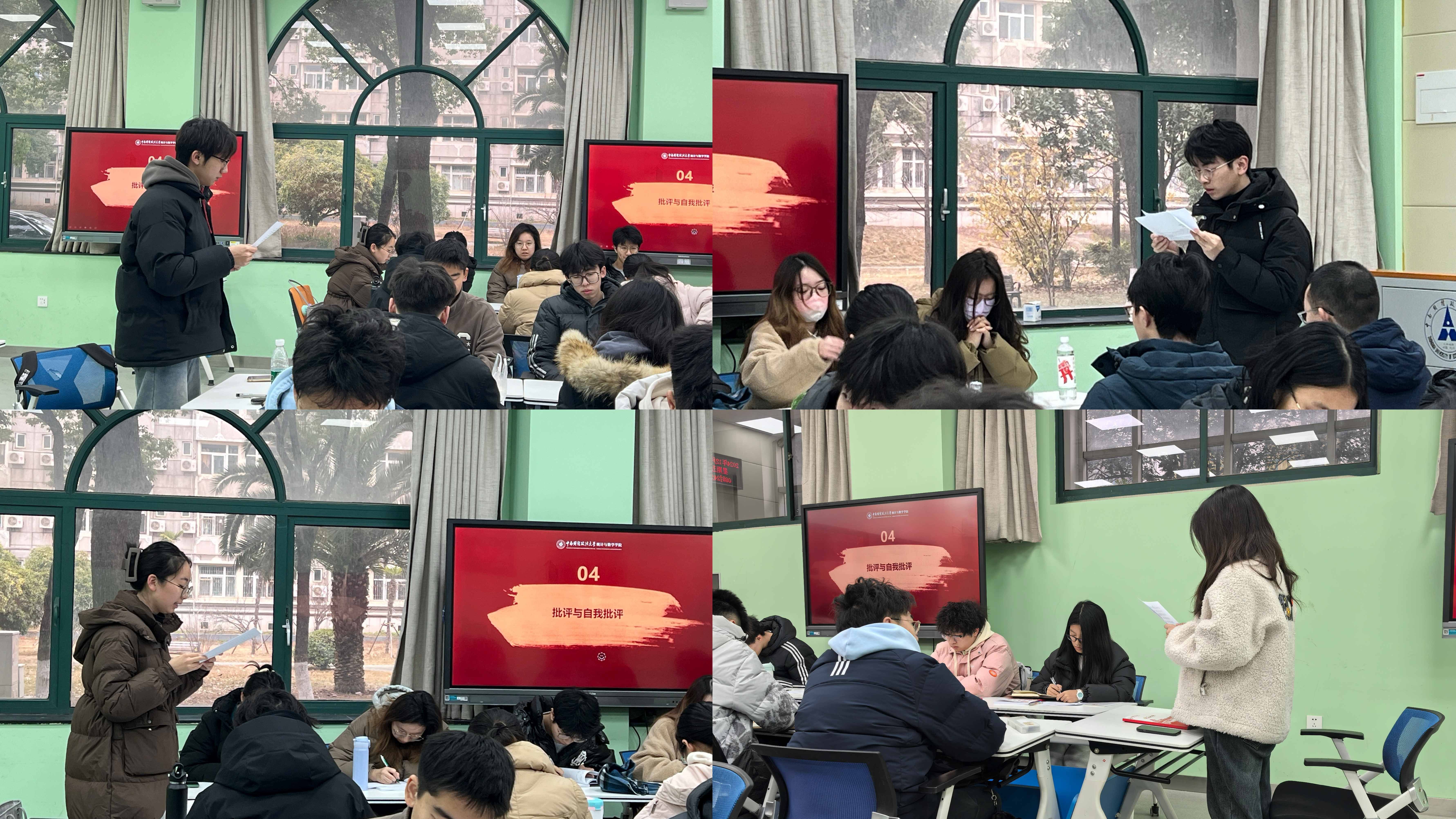 批评和自我批评是提高个人素质和党支部战斗力的重要手段。4名支委率先垂范,他们以严肃认真的态度带头开展深刻的自我剖析和相互批评。随后,其余成员以党小组为单位开展批评和自我批评,党员同志们直面问题,不回避矛盾,不掩饰缺点,展现了共产党员勇于自我革命的精神。李嘉佳、陈智睿、查雨珩同志分别对组内情况进行汇报。李嘉佳同志指出组内成员存在工作拖沓、理论学习不足的问题;陈智睿同志表示部分成员存在积极性欠缺、出勤率较低的问题;查雨珩同志表示一些成员时间管理能力较差、对党的理论认识层次较浅。党支部的批评和自我批评工作达到了预期目的,不仅加强了党员之间的交流与沟通,也促进了党员个人的成长和党支部整体工作的改进。