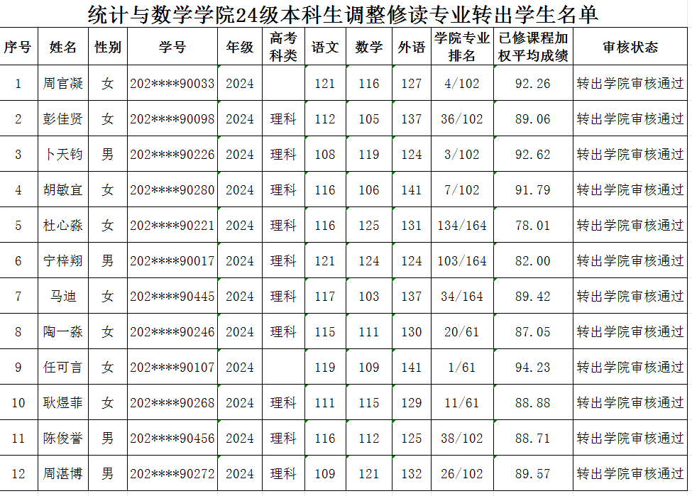 为了促进学生的个性发展,提高学生学习的积极性和创造性,根据《米兰电竞·(中国区)本科生调整修读专业(类)管理办法》(中南大教字[2023]43号)文件精神、《统计与数学学院本科生调整修读专业(类)实施细则》和教务部《关于做好2024级普通本科学生调整修读专业(类)工作的通知》的要求,学院对2024级申请调整专业的转出学生进行了资格审查,现将审查结果予以公示:
