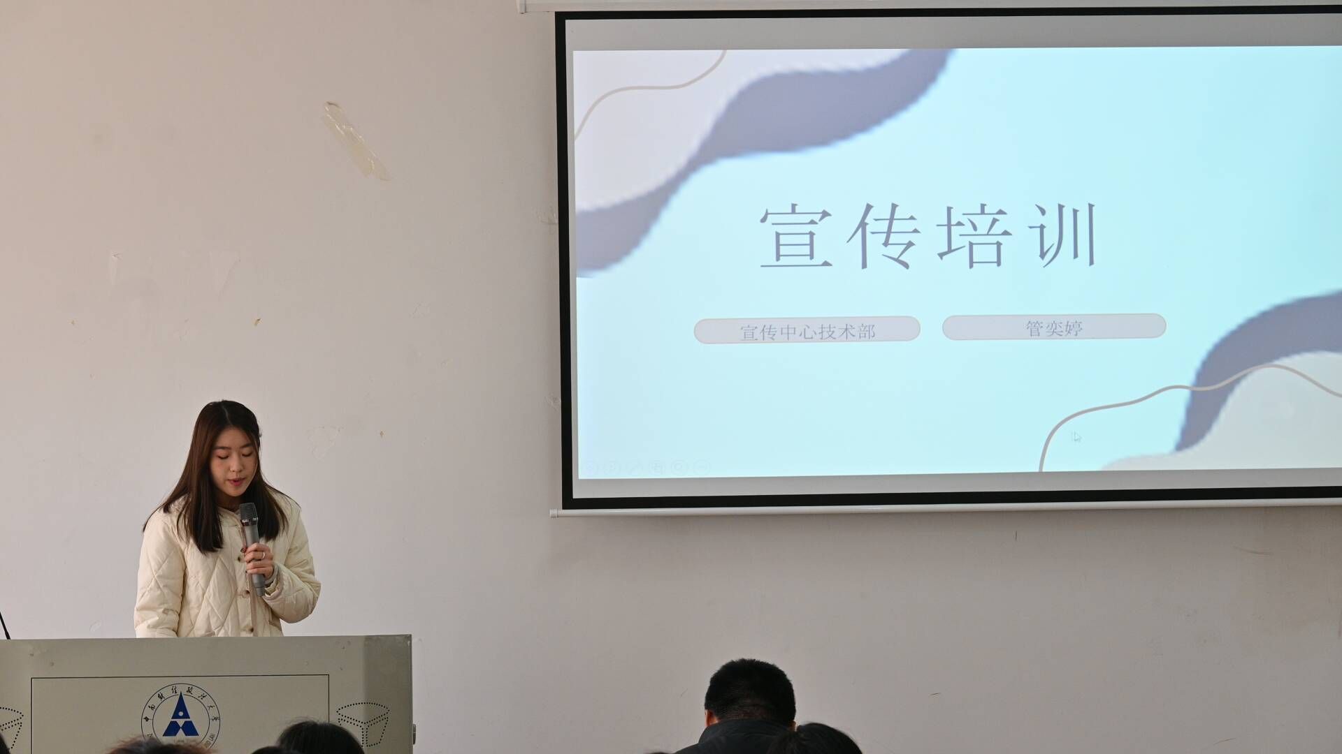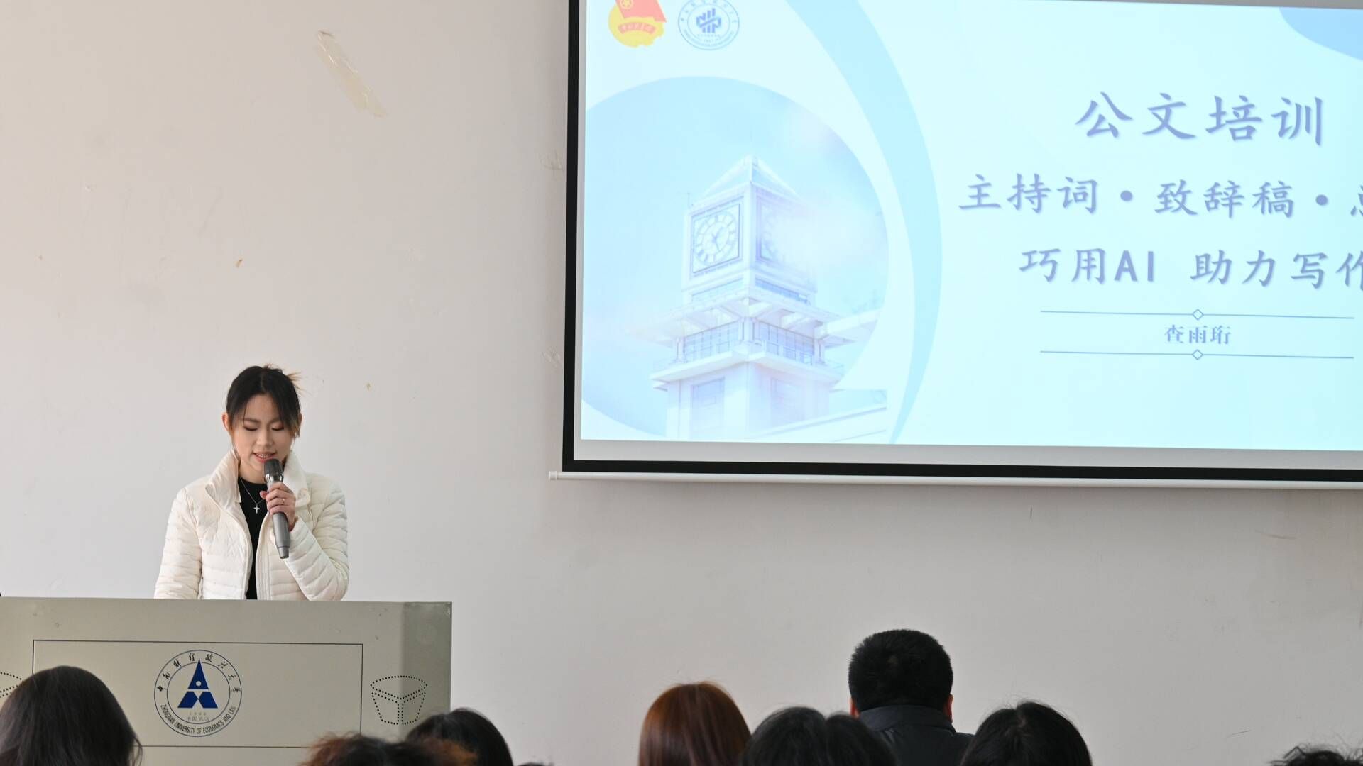 活动第一项,嘉宾授课。院团委团学骨干成员查雨珩从主持稿、致辞稿、总结类材料三个方面,分别阐述了公文写作的技巧和方法,并且强调了合理运用AI辅助公文写作的重要性。同时,她还详细介绍了在不同场合、面对不同嘉宾身份时,如何恰当地撰写公文。随后,宣传中心新媒体技术部负责人管奕婷分享了宣传视频和海报的制作经验,重点讲解了如何更好地运用剪映以及如何高效地寻找素材。