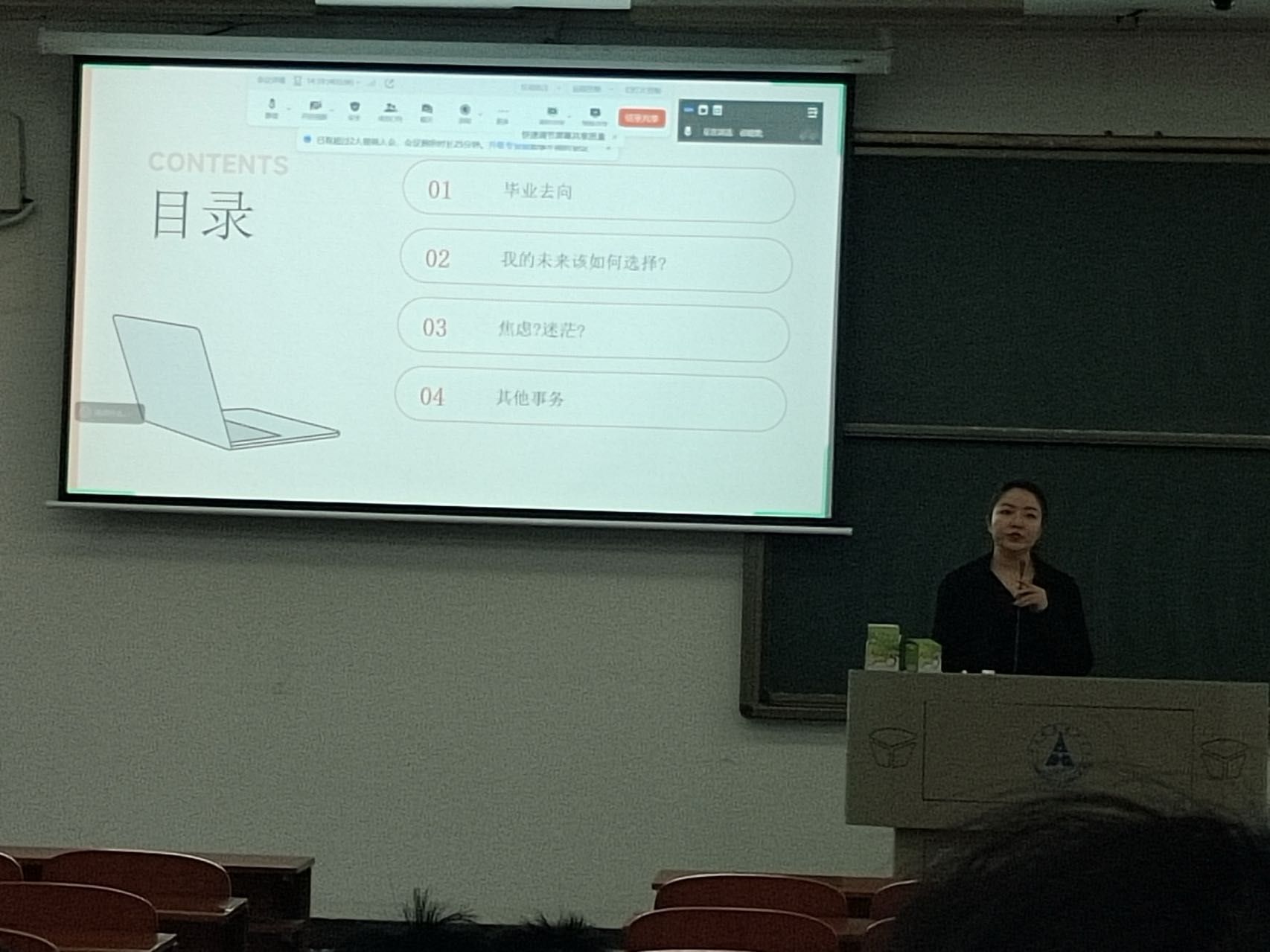 古丽老师通过分析我院本科毕业生就业升学态势,针对不同发展方向提出专业建议:计划升学的同学应尽早完成目标院校锁定,科学规划备考进程,重点关注各高校夏令营及预推免动态;计划考公与就业的同学需把握秋招关键窗口期,定期查阅学校就业信息网岗位数据库;意向出国深造学生应完善语言成绩与科研背景,主动与师兄师姐交流经验。针对学生普遍存在的规划焦虑,古丽老师强调“差异化发展观”,引导学生立足个人特长与职业兴趣选择成长路径,鼓励学生积极参与每周谈心谈话,提供全方位情绪疏导与规划支持。