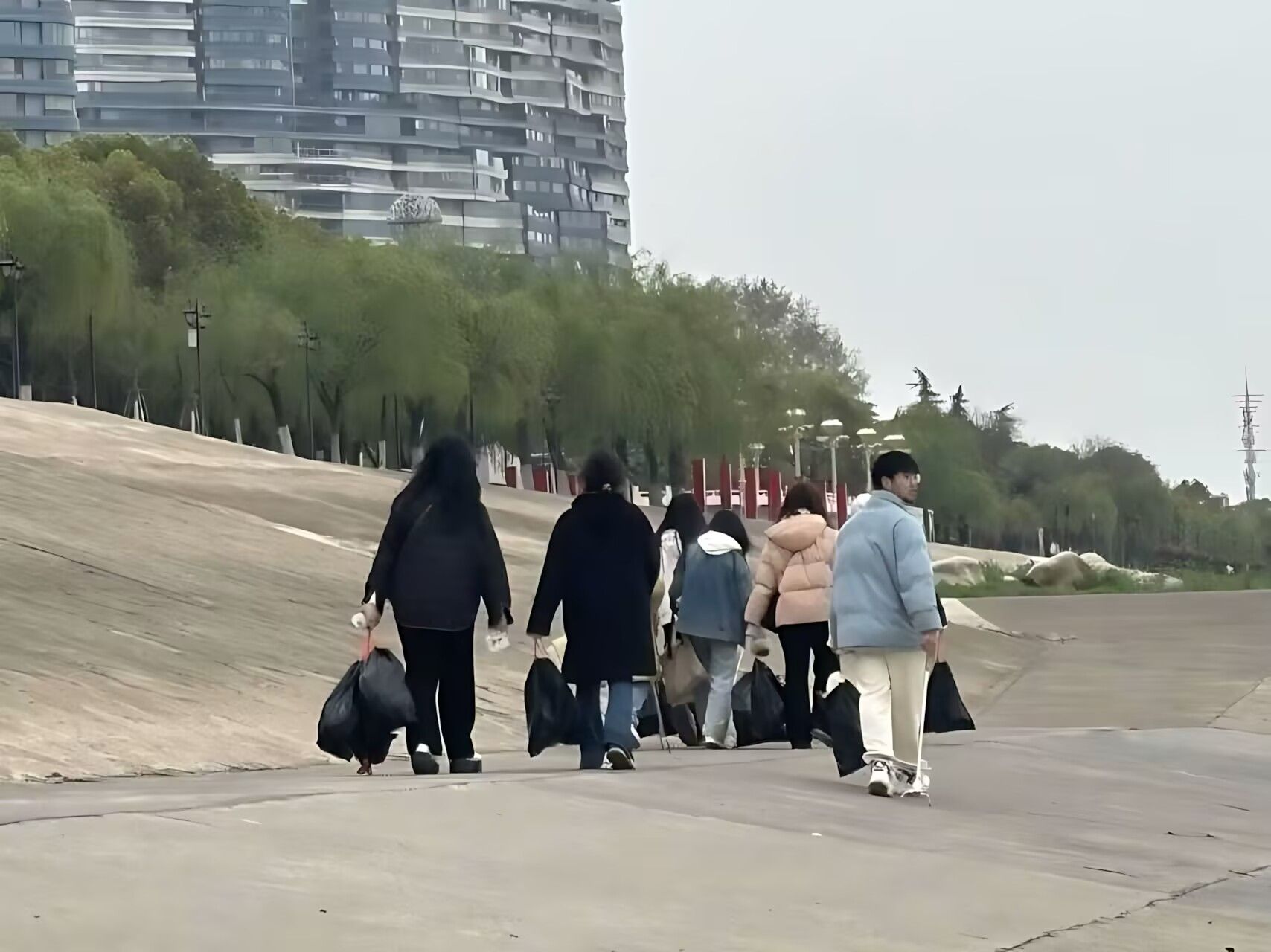 绵绵细雨中,十余名志愿者在活动负责人的带领下按照规划的路线步行前往江滩。抵达活动区域后,负责人为每位志愿者配发垃圾袋与手套,志愿者迅速分散至江滩各处展开清洁工作。面对塑料袋缠绕杂草根系、饮料瓶嵌入滩涂淤泥等棘手状况,大家弯腰曲背,用夹子夹取、徒手掏挖,不放过任何一个卫生死角。虽然江滩垃圾数量多且清理困难,但志愿者们没有一丝懈怠,认真拾起每处角落里的垃圾。