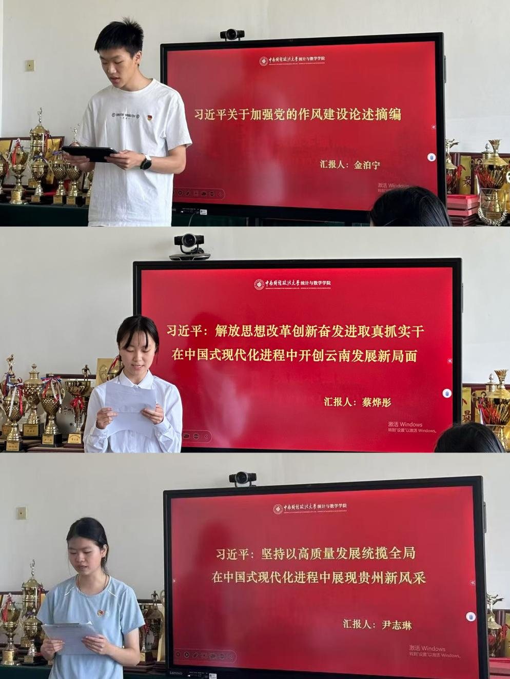 理论领学环节,金泊宁、蔡烨彤、尹志琳三位同志分别围绕《习近平关于加强党的作风建设论述摘编》及习近平总书记关于云南、贵州发展的重要讲话精神展开深度解读。金泊宁同志结合学生党员实际,强调“作风建设永远在路上”,号召以“严真细实快”的标准提升自身修养;蔡烨彤同志通过“解放思想、改革创新”的云南发展实践,阐释中国式现代化的区域探索;尹志琳同志以贵州“高质量发展”案例,解读新发展理念的落地路径。领学内容紧扣时政热点,结合支部建设需求,为党员注入“理论+实践“双动力,推动党的创新理论入脑入心。