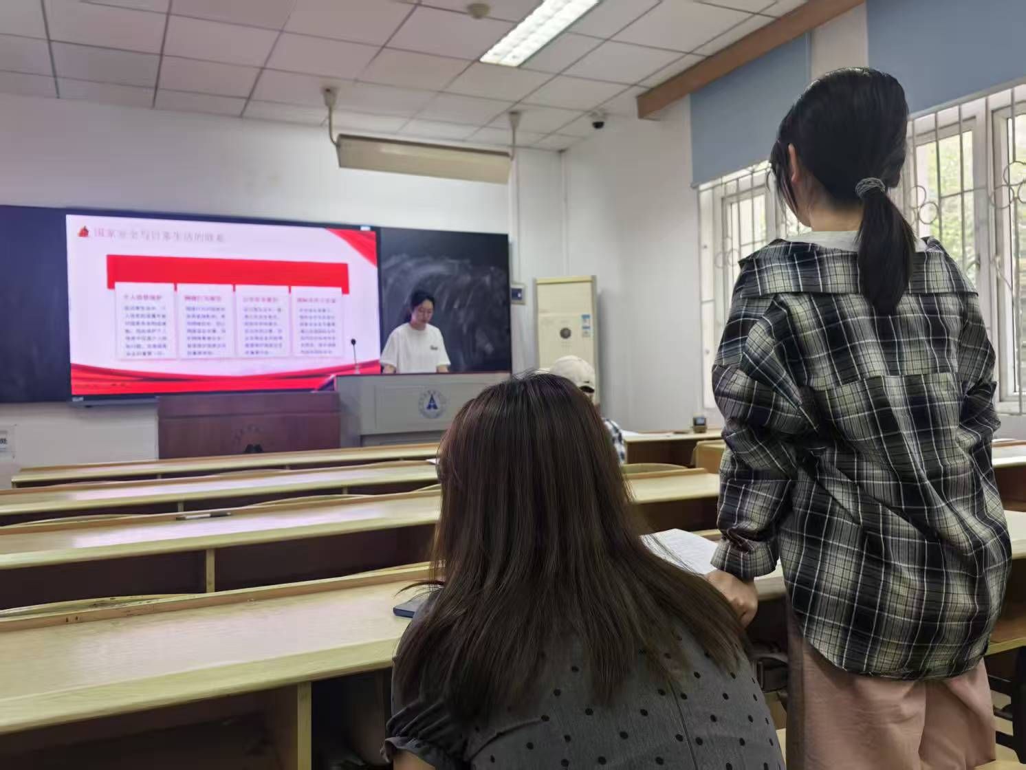 紧接着,团支书带领大家了解国家安全与日常生活的联系:在日常生活中,个人信息的泄露可能对国家安全构成威胁,因此保护个人信息不仅是个人隐私问题,也是国家安全的重要一环;网络行为对国家安全有直接影响,规范网络言论、防止网络谣言传播、保护网络数据安全,都是维护国家安全的重要举措;在日常生活中,提高公共安全意识,如防范恐怖袭击、应对自然灾害、防止生物安全风险等,都是维护国家安全的重要内容。团支部同学总结道,其实国家安全和我们的日常生活息息相关,每个人都要尽自己的力量维护国家安全。