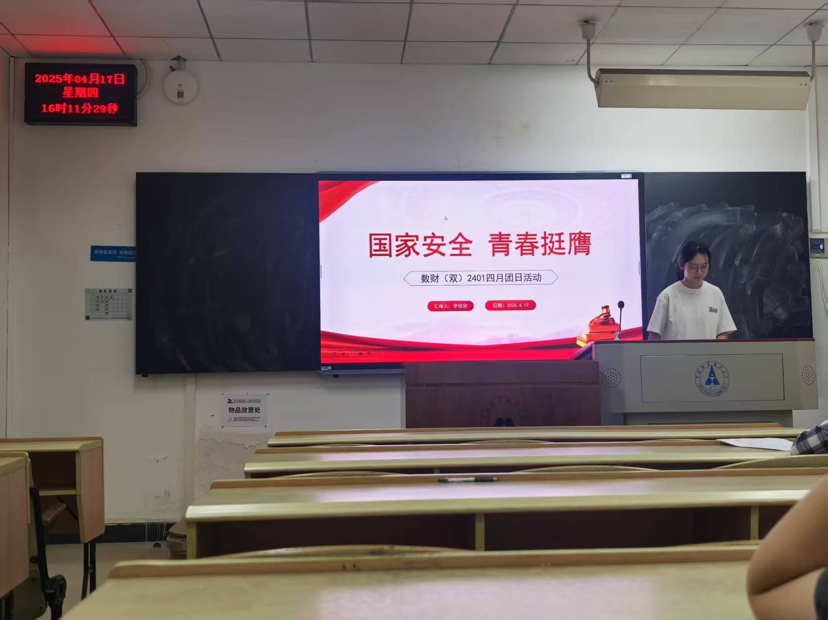 (通讯员:李艺菲、王晗)2025年4月15日是第十个全民国家安全教育日,自2016年设立以来,这一节日已成为普及国家安全知识、增强全民国家安全意识的重要载体。今年国家安全教育日的主题是“全民国家安全教育,走深走实十周年”,旨在总结过去十年的经验,推动国家安全教育进一步深化。在此背景下,数财2401团支部于4月17日下午16:00在文泽楼102教室召开以“国家安全,青春挺膺”为主题的团日活动,旨在加强同学们对于国家安全知识的了解,巩固国家安全教育。