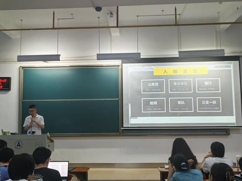 生涯规划指导老师薛凯仁在考公形势分析环节,对公务员、事业单位、选调生、银行、军队文职等考公考编路径进行逐一梳理。通过明确各考试关键时间节点、解析核心考试内容、剖析招录比例与竞争格局,引导学生充分认识考公形势,着重强调应届毕业生身份的重要性,鼓励学生提前谋划、积极备考。