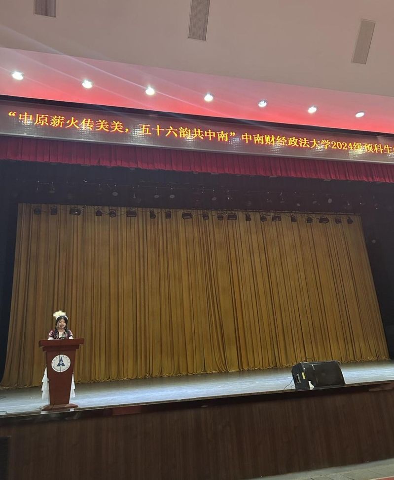 预科2402班夏丽巴提·加力哈斯作为学生代表发言。她回顾预科一年以来的学习生活,从初入校园的不安到自信成长,分享学业收获与民族团结情谊。她表示,这段经历让自己深刻理解“中华民族一家亲”,未来将带着所学所悟,在本科学习中继续奋斗,勇担青年使命。