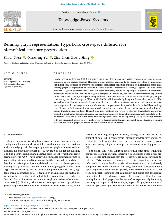 (通讯员:张冉)我院2022级金融数学专业本科生陈智睿在姜旭初副教授的指导下,于中科院一区Top期刊《Knowledge-Based Systems》(A类)上以第一作者身份发表论文:Refining Graph Representation: Hyperbolic Cross-space Diffusion for Hierarchical Structure Preservation。此外,本文的主要作者还包括2024级应用统计专业硕士余虔诚和陈潇。该项目于2024年9月启动,在姜旭初老师的细心指导下历时4个月投出。