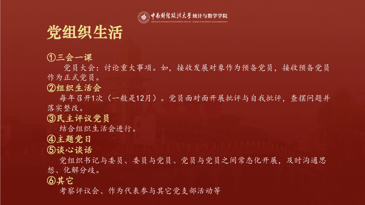 随后,杨奕睿同志就党组织生活、预备党员职责与义务等支部基本事务进行规范说明,系统梳理支部组织架构、职责分工及制度规范,为推进支部规范化建设进一步夯实基础。