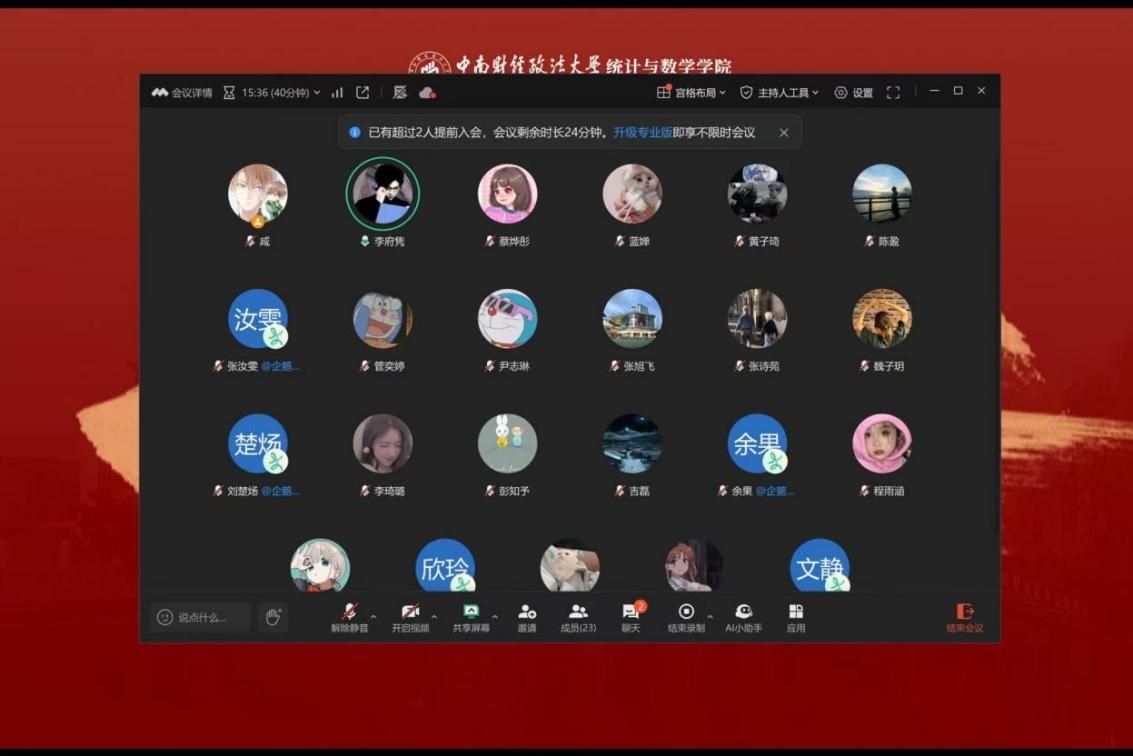 (通讯员:蔡烨彤)为深入学习贯彻习近平总书记重要讲话内容,落实《中国共产党党徽党旗条例》专题教育,弘扬中央八项规定精神,统计与数学学院2023级本科生党支部于7月28日以线上会议形式,开展“深入贯彻中央八项规定精神,扎实推动学习教育取得实效”主题党日活动。