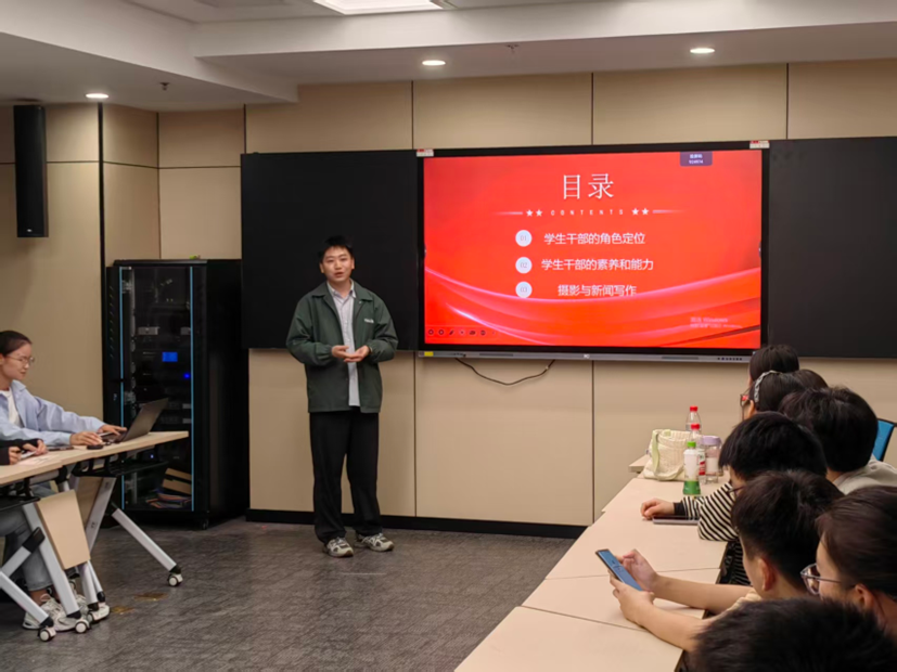 最后,吴志伟老师围绕学生干部角色定位、学生干部能力素养提升、摄影与新闻写作技巧等方面展开专题培训。他强调,学生干部需以双重身份严格要求自己,明确自身定位,提升本领能力,主动从“个体学习者”向“团队协调者”转变,努力成为一名优秀的学生干部。会议最后,全体参会人员合影留念。