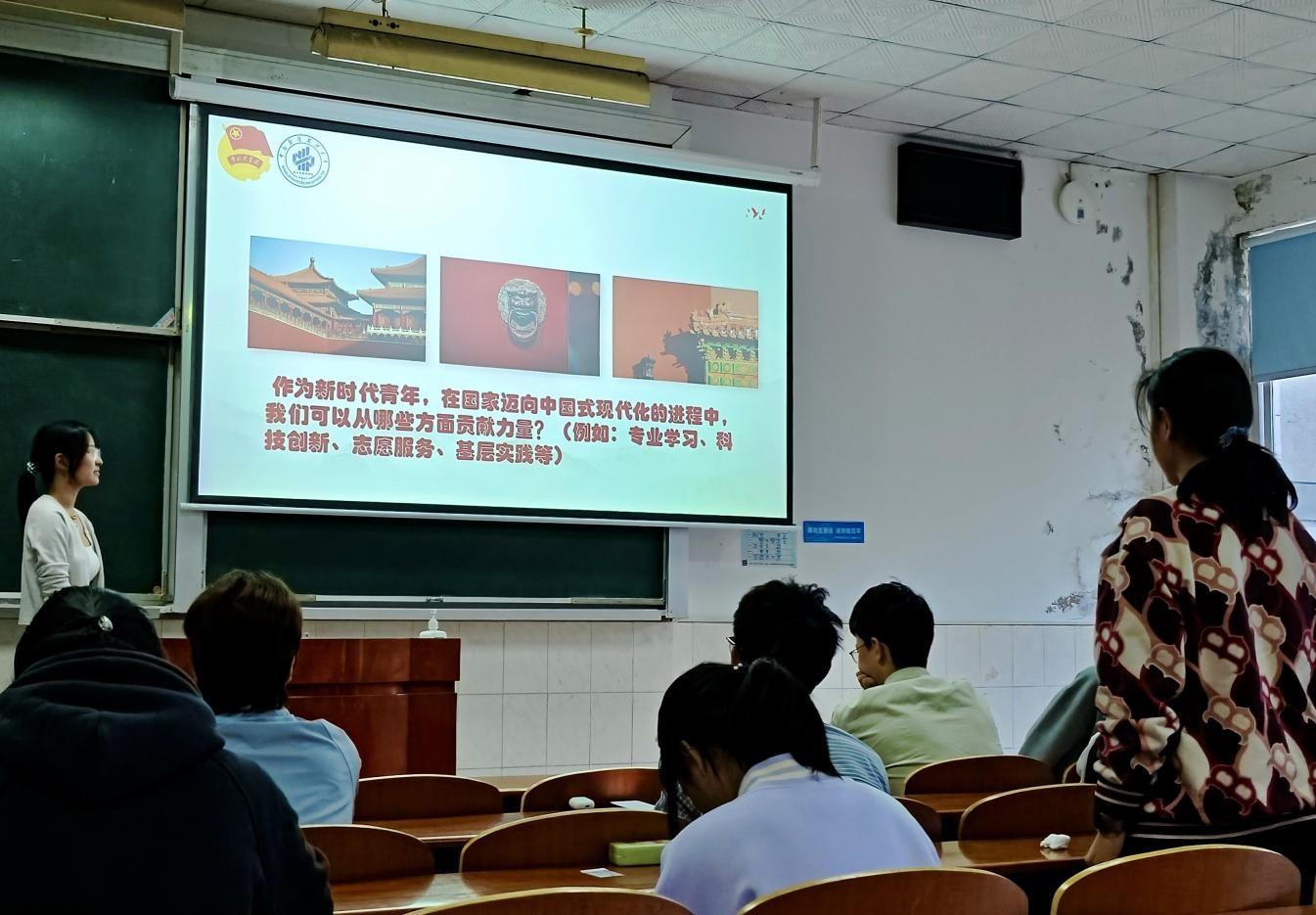 最后,为进一步强化学习效果,主持人提问:“作为新时代青年,在国家迈向中国式现代化的进程中,我们可以从哪些方面贡献力量?”同学们积极参与讨论,结合所学知识各抒己见。杨雯舒同学分享道,她会积极参与志愿服务,主动参与科创竞赛创业项目,并结合自己的专业深耕大数据和人工智能等前沿领域为国家贡献力量。