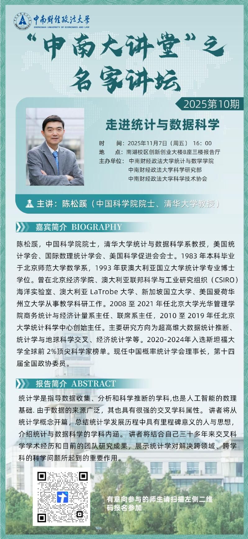 【讲座预告】“中南大讲堂”之名家讲坛(2025第10期)——陈松蹊院士谈“走进统计与数据科学”