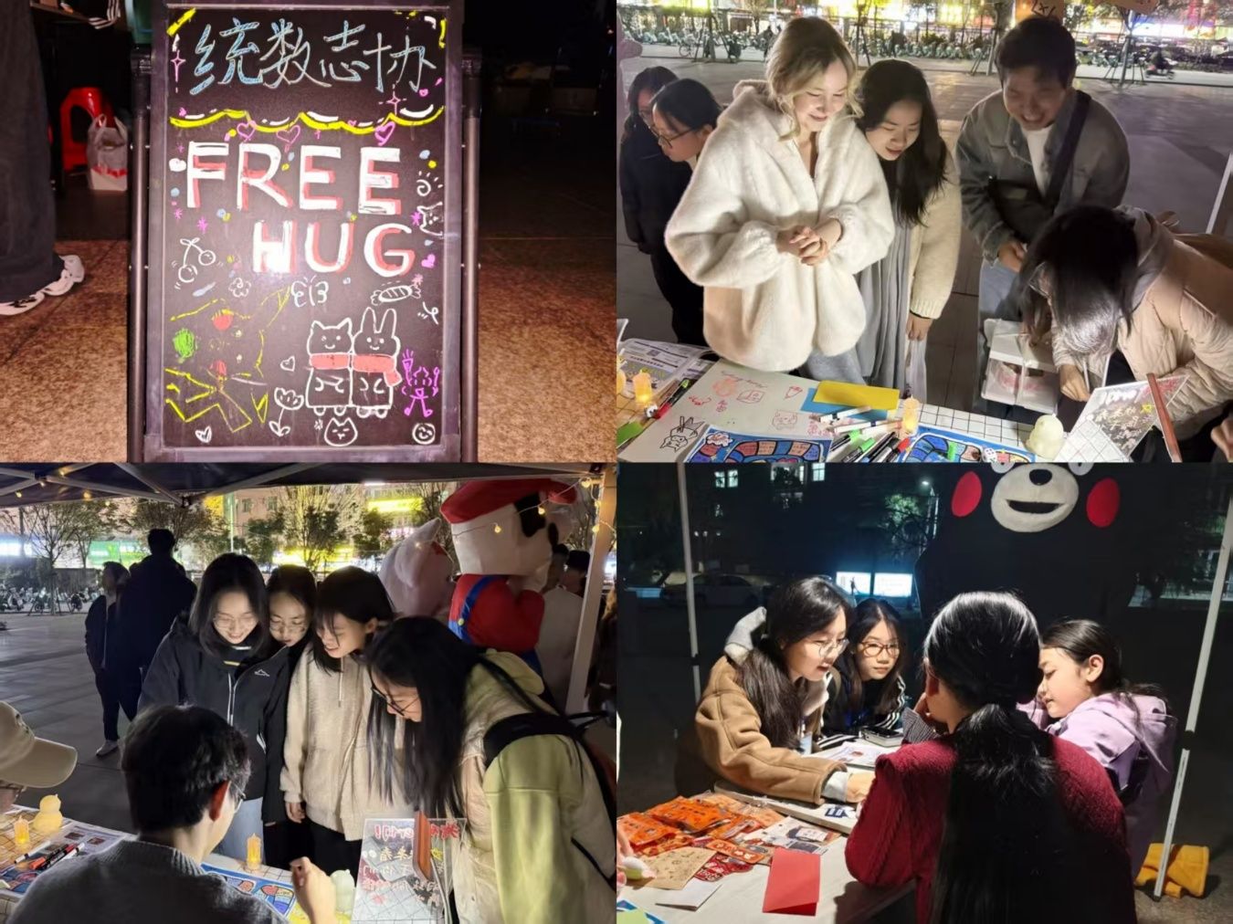 志愿者们身着可爱玩偶服装,主动向过往同学挥手致意,送上一个个真诚的拥抱。“情绪飞行棋”引导参与者在游戏中回溯美好记忆,重温感动瞬间;“便签心愿纸”则成为同学们情感交流的桥梁,一字一句的祝福在方寸纸片间悄然流动;“同画一幅画”汇集众人笔触,共创一幅充满温度的艺术作品;而在“爱心折纸”区,一只只亲手折成的千纸鹤与纸心,承载着祝愿飞向更多人。