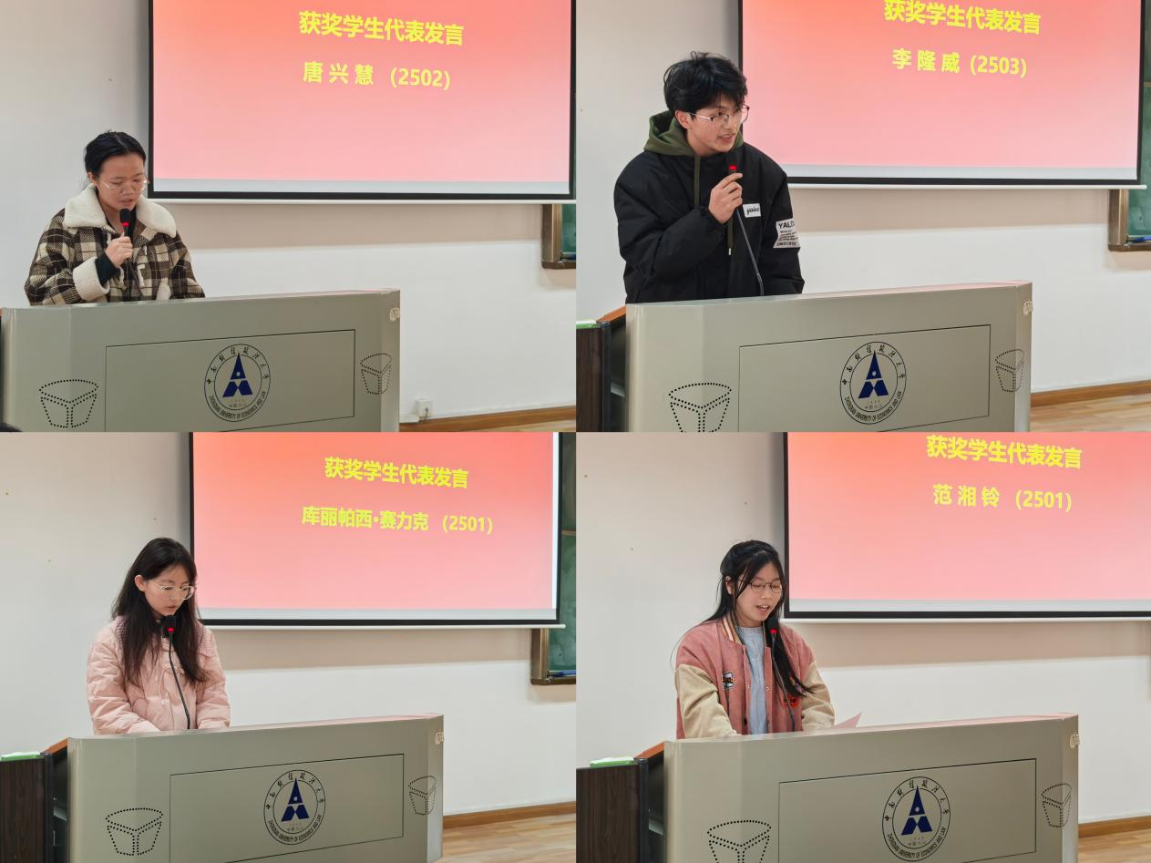 获奖学生代表唐兴慧、李隆威、库丽帕西·赛力克依次分享学习心得。他们用朴实的经验、真诚的建议,为同学们提供了可复制、可借鉴的“提分路线图”。