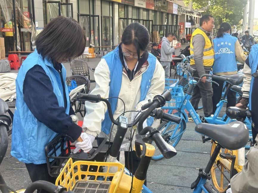 此次活动积极响应武汉市城市管理执法委员会推动公众参与城市治理的号召,聚焦共享单车停放乱象,探索“政——校——企”协同治理路径。在单车使用频率高、停放问题突出的光谷软件园区域,志愿者们分工协作,将不同品牌的共享单车统一扶正、归位,按颜色分类停放在指定区域内,确保车辆“入框、整齐、朝向一致”。同时,他们还仔细清理了车身上的小广告与污渍,维护单车作为城市“流动风景”的整洁形象。